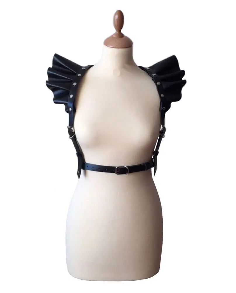 Портупея Ангел выполнена из натуральной кожи черного цвета. Крылья крепятся к ремням при помощи кнопок. Ремни регулируются на талии, спине и плечах. Обхват талии от 60 до 89 см.