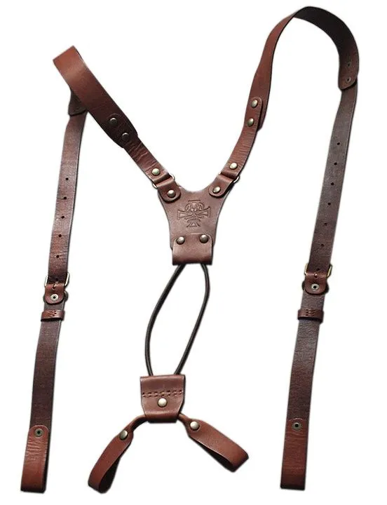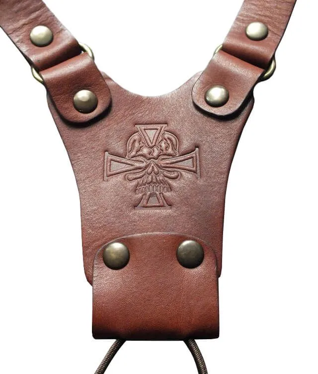Подтяжки производства российской компании "Подиум" сделаны из натуральной кожи коричневого цвета и декорированы клише с изображением черепа. Такой аксессуар, помимо выполнения своей функциональной роли, поможет Вам в создании нужного образа. Подтяжки визуально сделают силуэт более подтянутым и добавят брутальности.