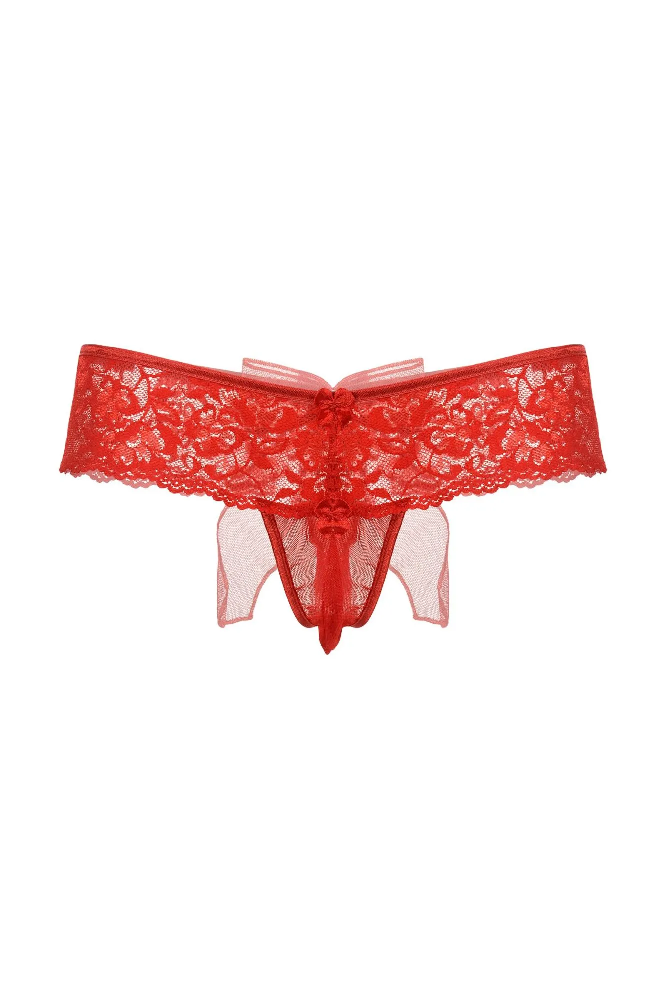 Шикарные кружевные трусики с открытым доступом. Роскошное кружево облегает соблазнительные изгибы бедер и ягодиц. Два маленьких бантика с крошечными бусинами притягивают взгляд. Интригующий бант из тюля, как вишенка на торте, завершает сексуальный образ.