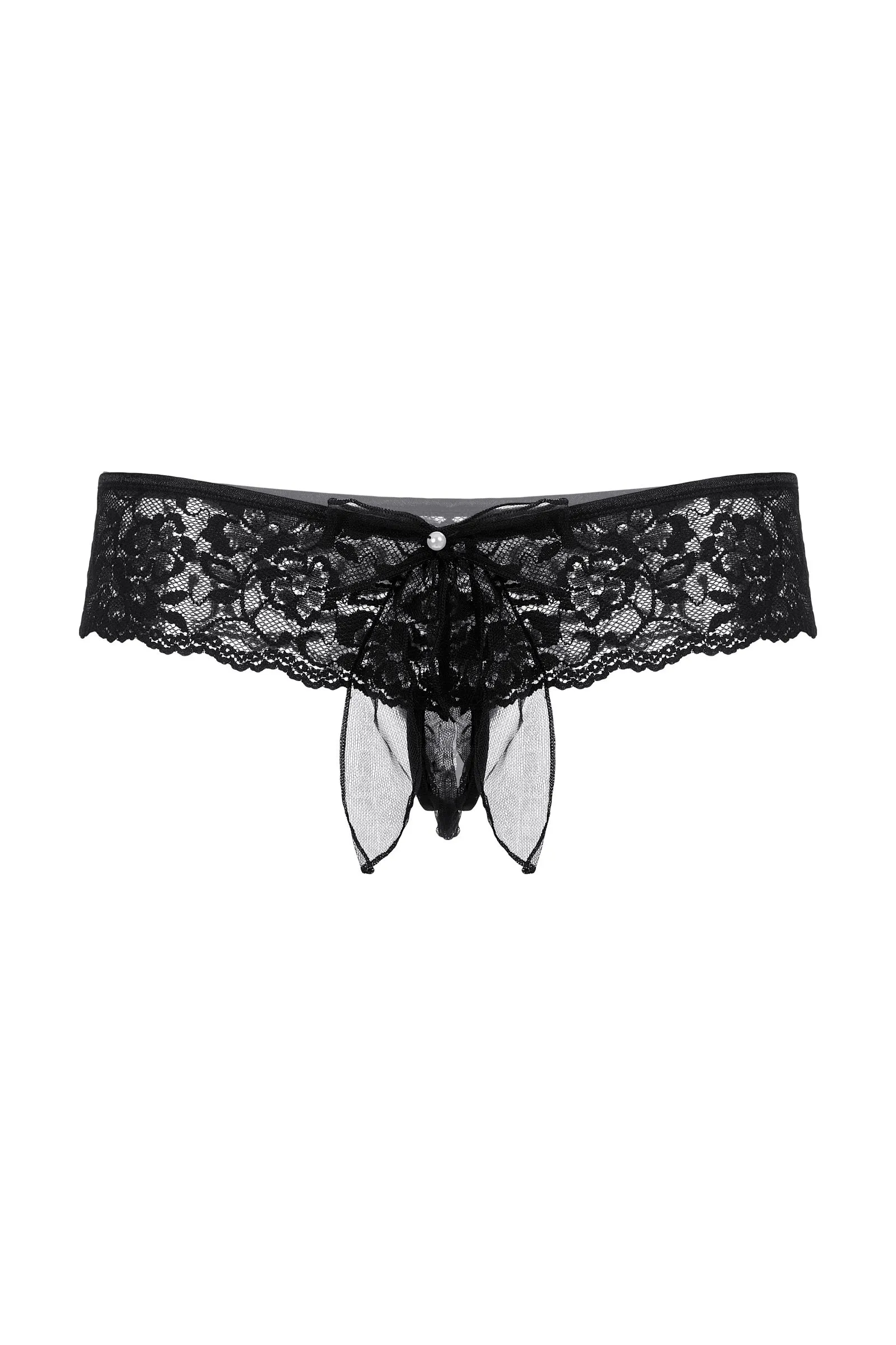 Шикарные кружевные трусики с открытым доступом. Роскошное кружево облегает соблазнительные изгибы бедер и ягодиц. Два маленьких бантика с крошечными бусинами притягивают взгляд. Интригующий бант из тюля, как вишенка на торте, завершает сексуальный образ.