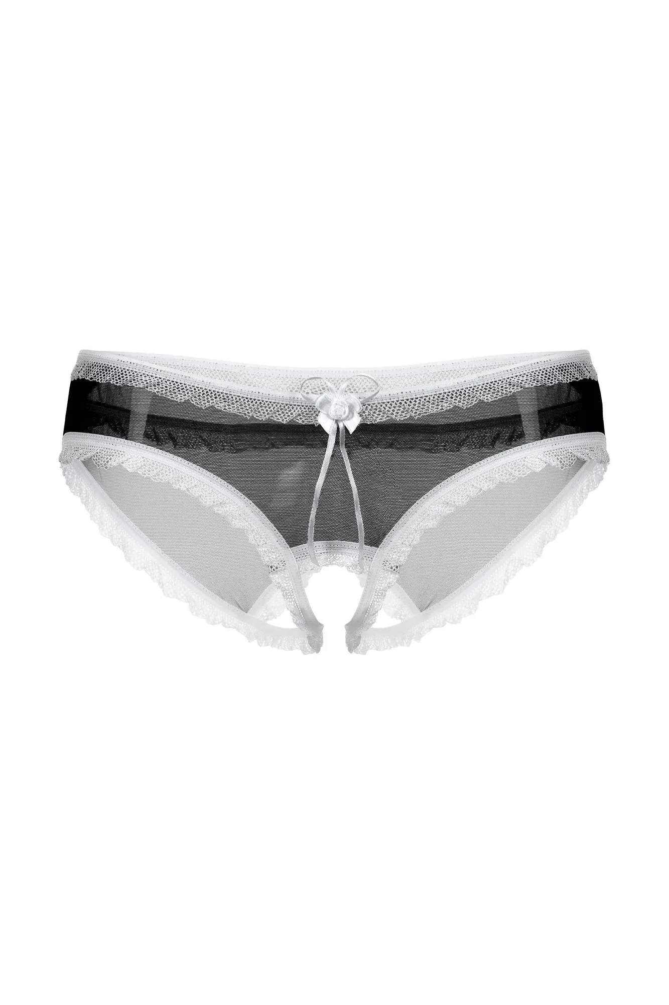 Трусики с открытым доступом. Нежная тонкая черная сеточка в сочетании с белой рюшей и бантиком создают завершенный соблазнительный образ.