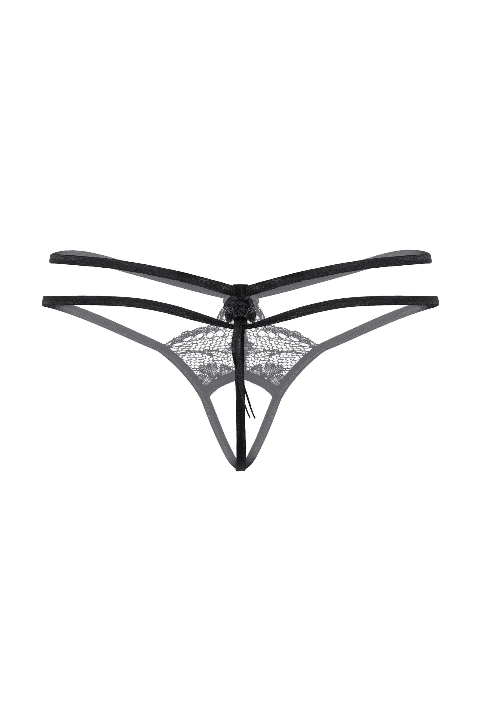 Кружевные стринги с открытым доступом. Спереди и сзади декорированы маленькими бантиками. Оригинальное сочетание нежного кружева и переплетения тесьмы.
