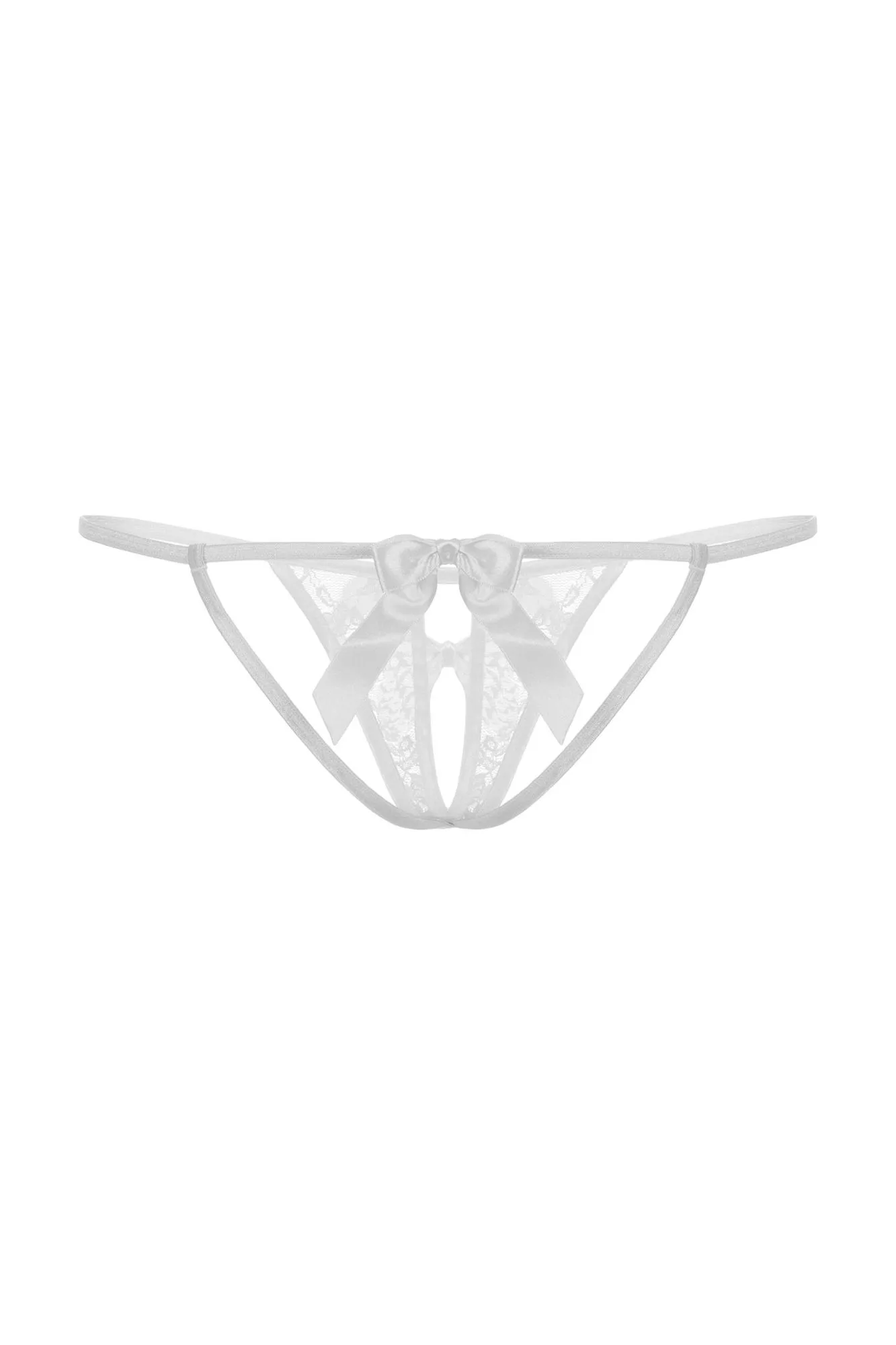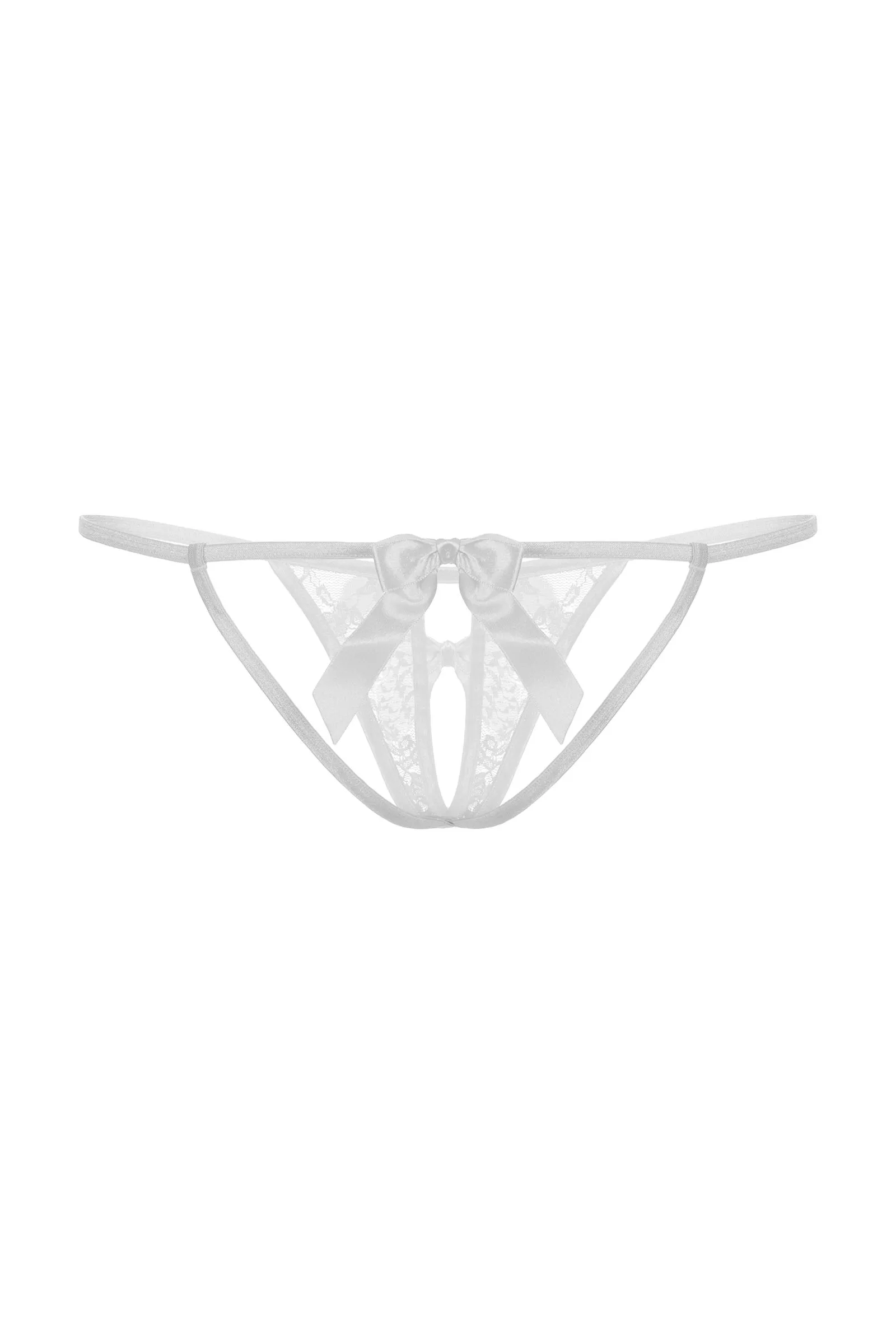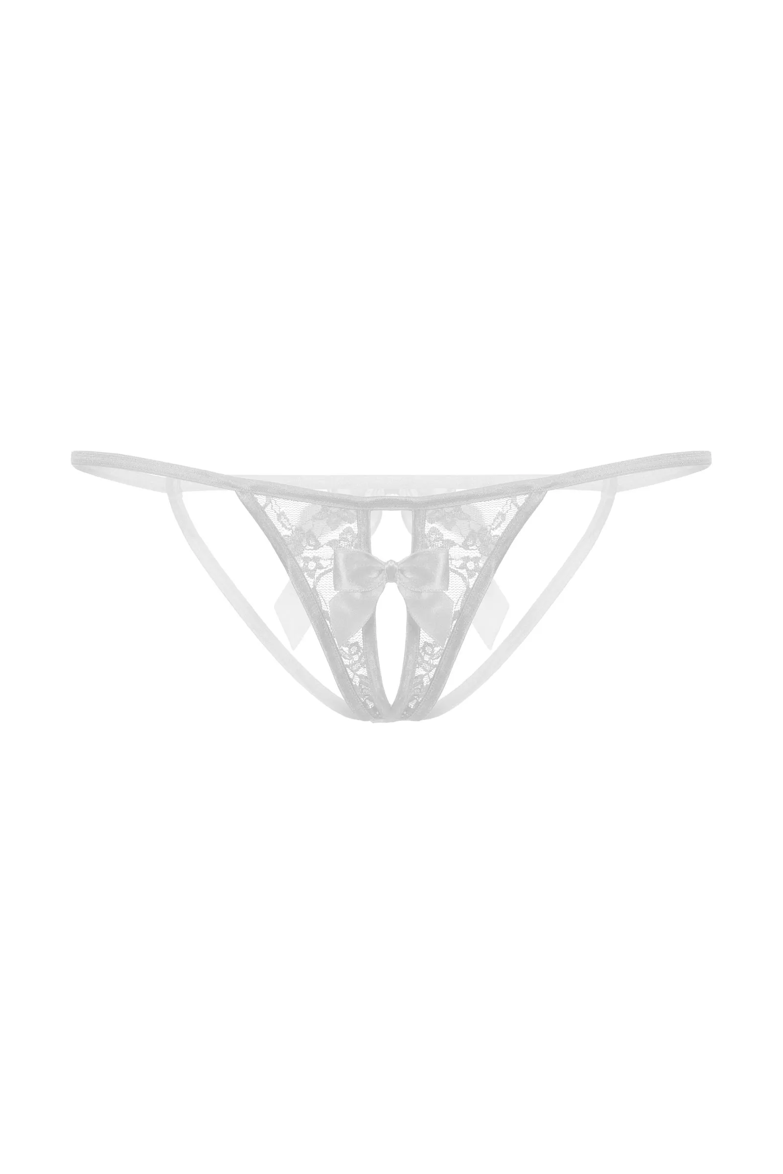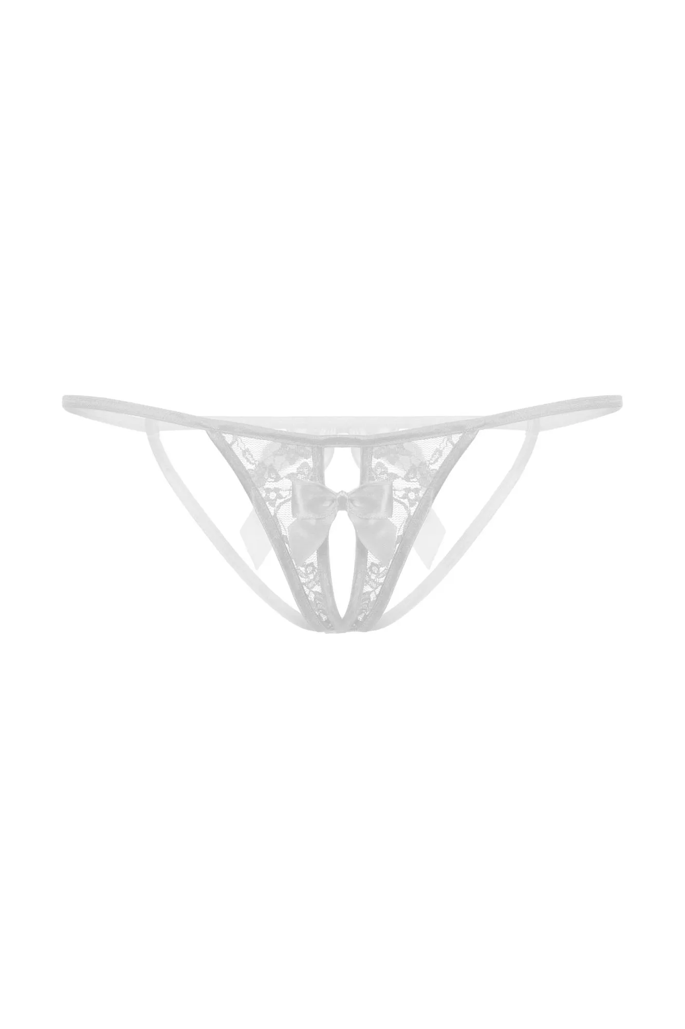 Открытые кружевные стринги белого цвета. Украшены атласным бантиком на середине выреза.
