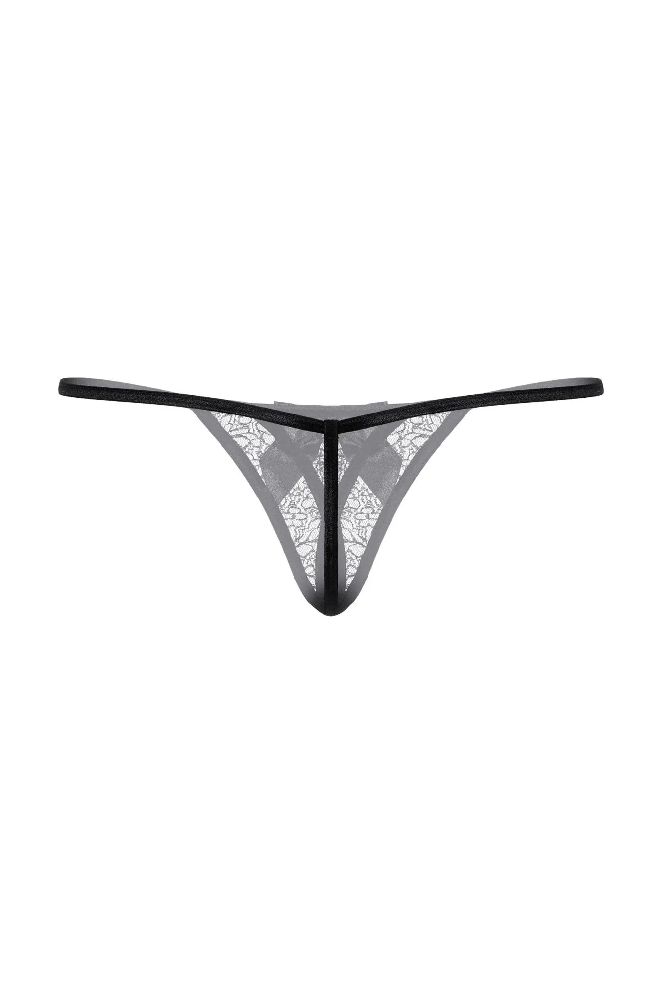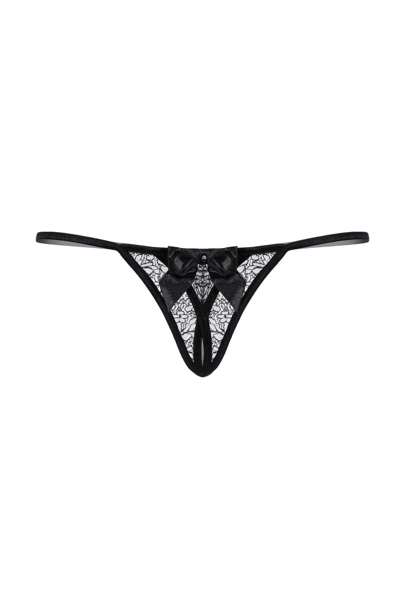 Открытые кружевные стринги черного цвета. Украшены атласным бантиком со стразом над вырезом..