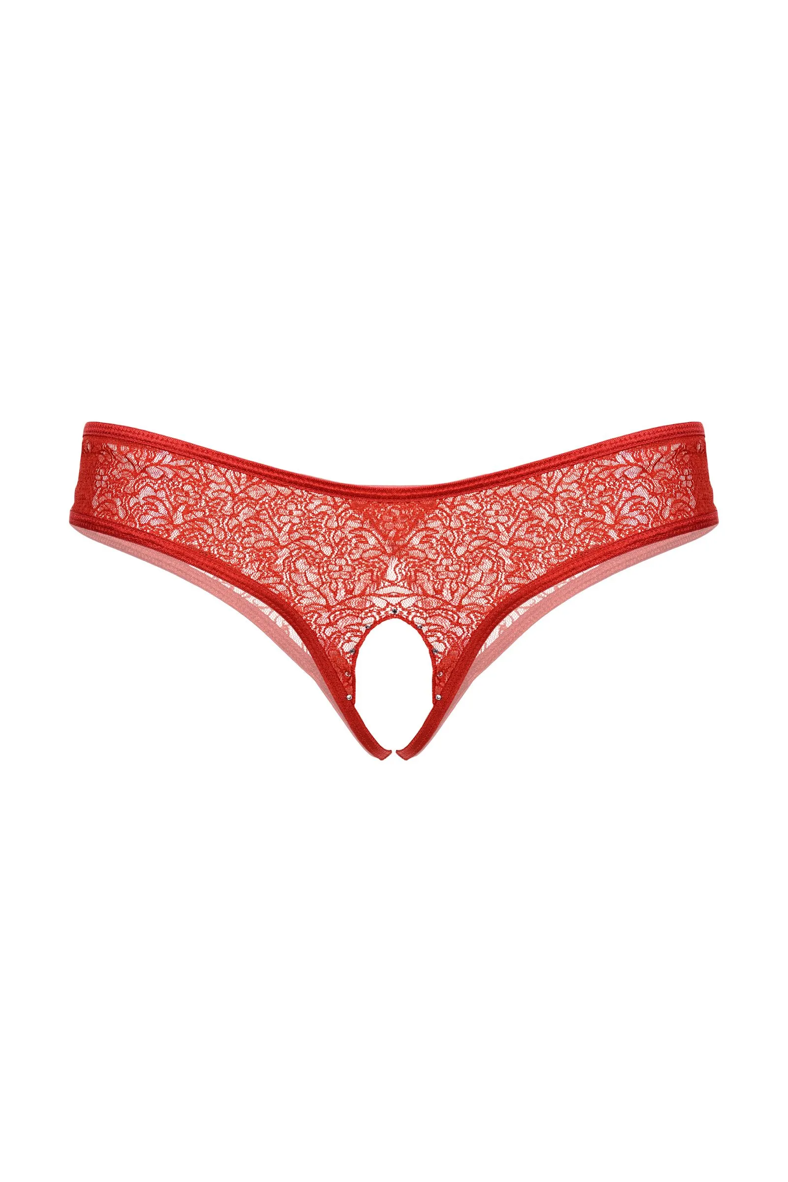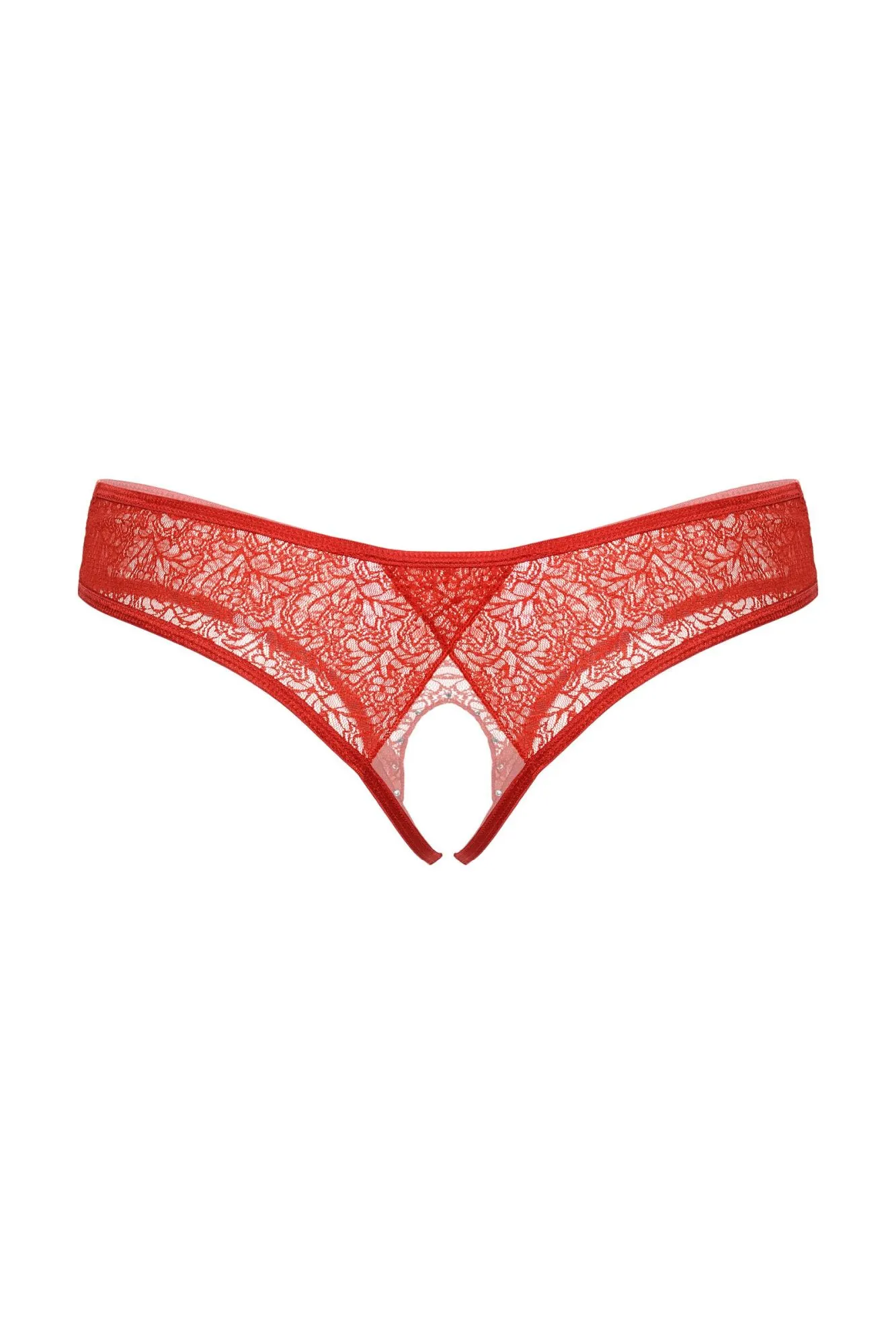 Стринги с доступом, выполненные из фактурного кружева, вырез в интимной зоне декорирован стразами.