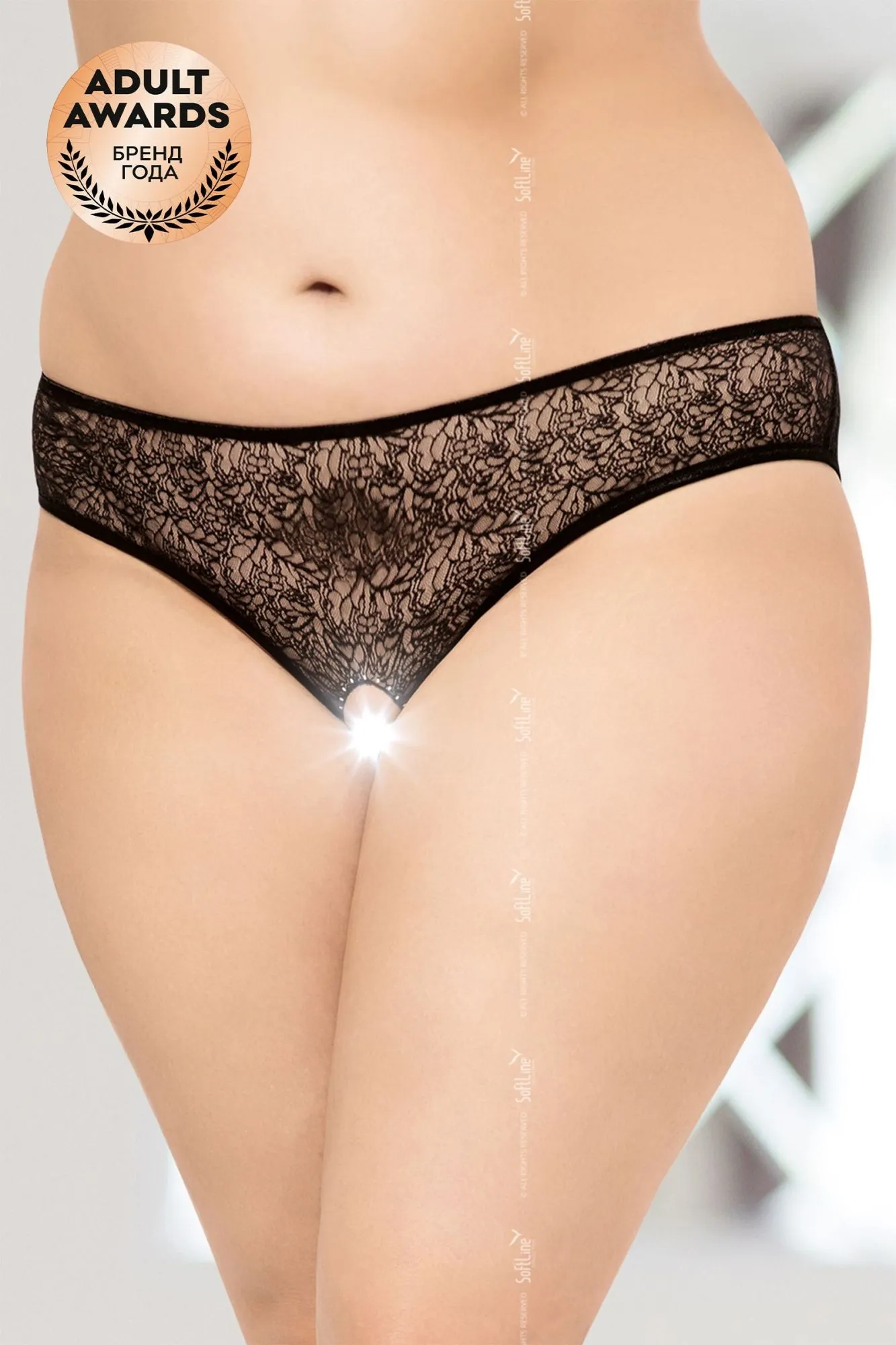 Трусики с доступом, выполненные из фактурного кружева, вырез в интимной зоне декорирован стразами.