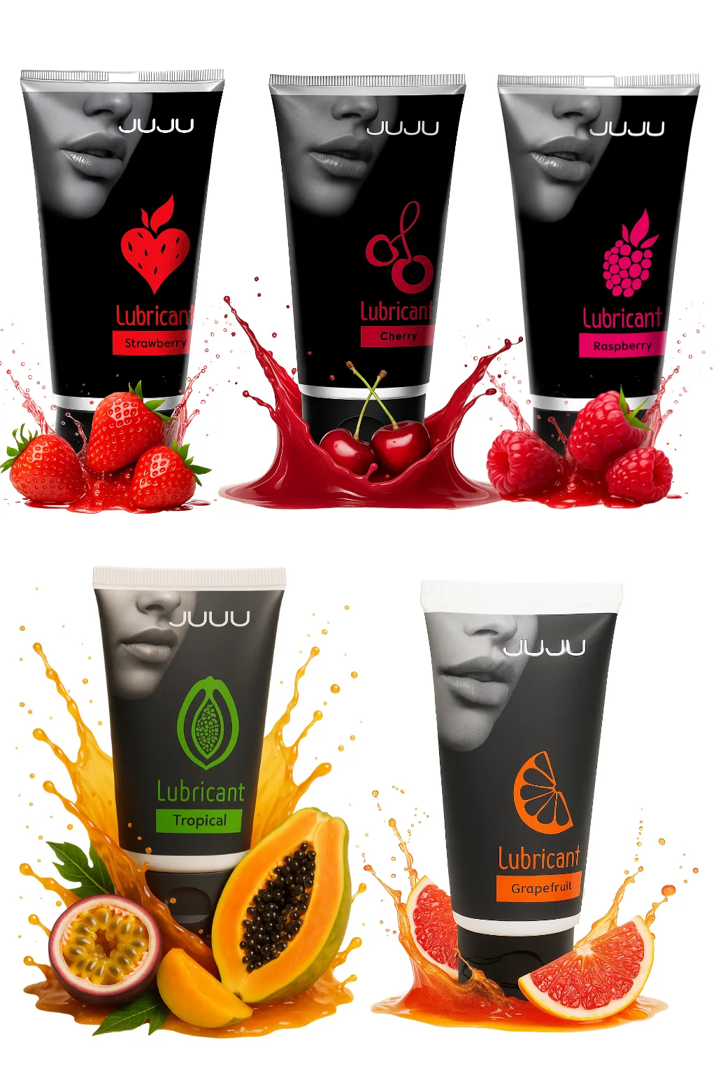 —Сет съедобных лубрикантов JUJU: клубника, малина, тропические фрукты, вишня, грейпфрут, 5х50ml 776JU