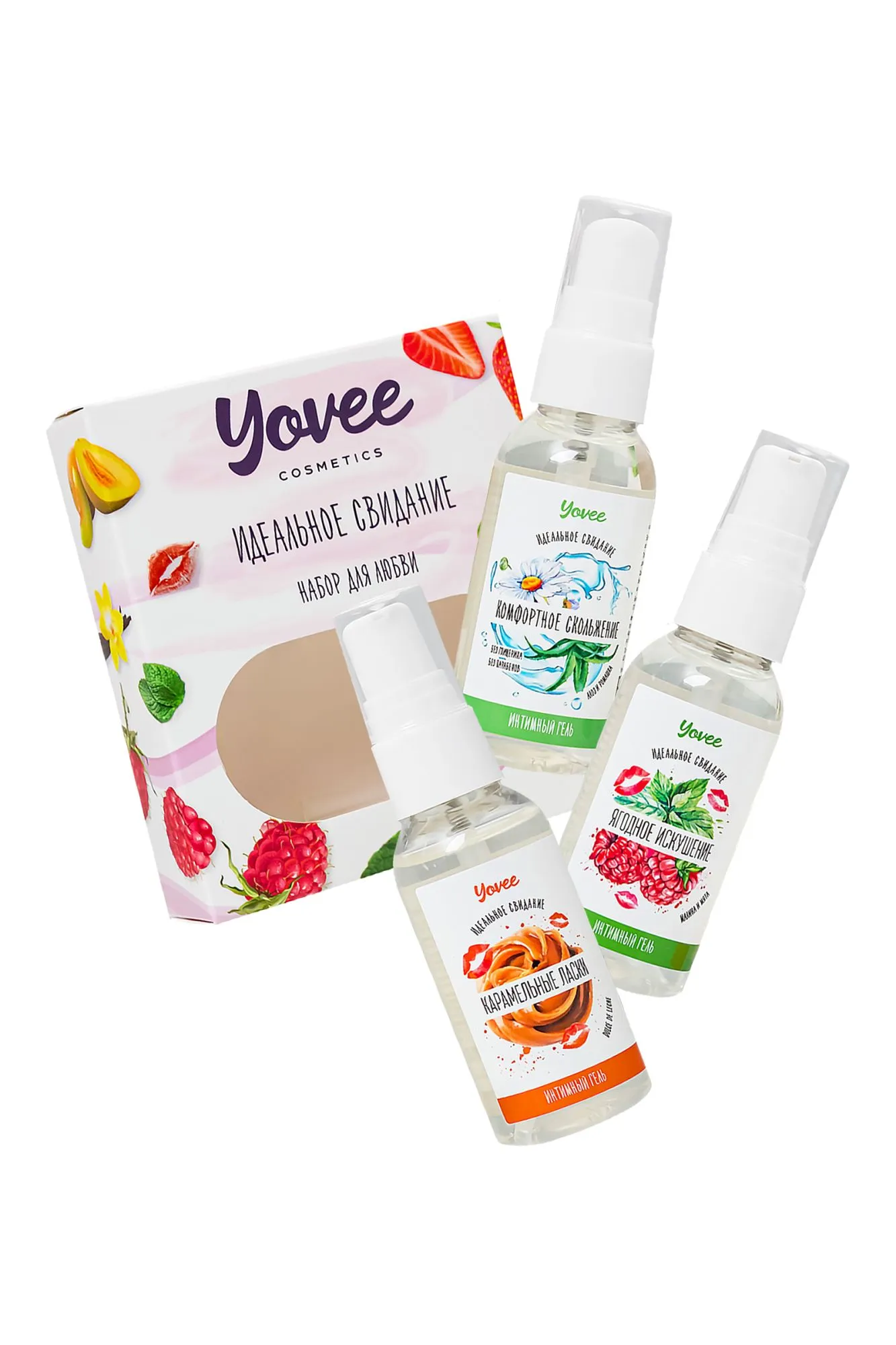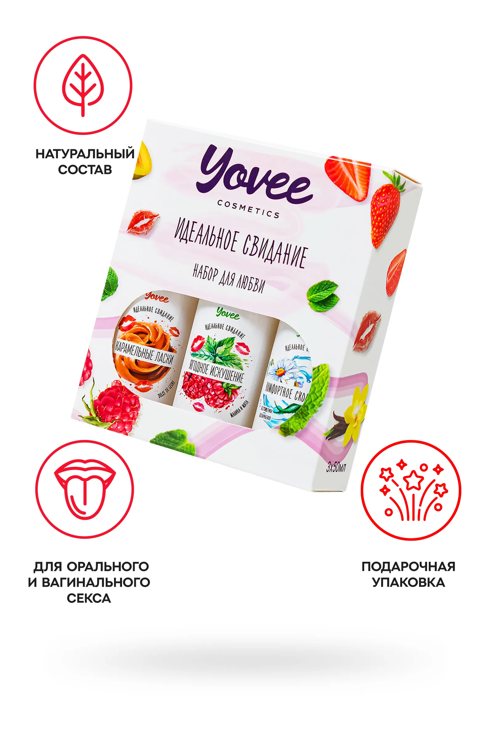 Набор интимных гелей "Набор для любви" от бренда Yovee - это отличный повод попробовать все и сразу. Набор состоит из трех интимных гелей-смазок: один без вкуса и запаха и два с яркими насыщенными вкусами и ароматами. Увлажняющий интимный гель-смазка с алоэ и ромашкой обеспечит долгое скольжение, увлажнение и смягчение слизистой. Съедобный гель с ярким малиново-мятным вкусом и ароматом или карамельно-сливочным вкусом популярного латиноамериканского десерта "Dulce de Leche" придаст оральному сексу еще больше пикантности и удовольствия. Каждый гель можно использовать как самостоятельно, так и смешав два или три геля и создав новый вкус, обогатив вкус десерта "Dulce de Leche" нотами малины и мяты, либо скорректировать уровень сладости при помощи геля "Комфортное скольжение". Гели подходят как для вагинального, так и для орального секса. Совместимы со всеми видами презервативов и игрушек для взрослых. ИДЕАЛЬНЫЙ ПОДАРОК ВОЗМОЖНОСТЬ СОЗДАТЬ СВОЙ ВКУС Все гели Yovee имеют простой и безопасный состав: вода; гидроксиэтилцеллюлоза - стабилизатор эмульсий, регулятор вязкости; Д-пантенол защищает слизистые, запускает процесс регенерации тканей; сорбат калия и бензоат натрия – безопасные пищевые консерванты, разрешенные в натуральной и органической косметике; лимонная кислота помогает поддерживать оптимальный уровень рН, является естественным консервантом. БЕЗ ГЛИЦЕРИНА БЕЗ ПАРАБЕНОВ БЕЗ КРАСИТЕЛЕЙ БЕЗ САХАРА Комплектация: Увлажняющая гель-смазка Yovee «Комфортное скольжение» с Д-Пантенолом, алоэ и ромашка, 50 мл Съедобная гель-смазка Yovee «Карамельные ласки» с Д-Пантенолом, со вкусом «Dulce de Leche», 50 мл Съедобная гель-смазка Yovee «Ягодное искушение» с Д-Пантенолом, со вкусом малины и мяты, 50 мл