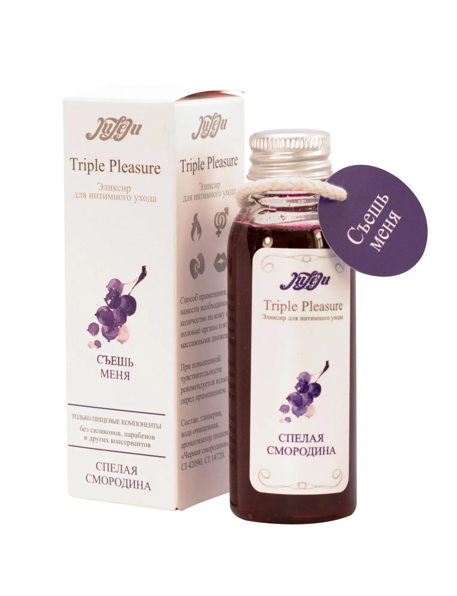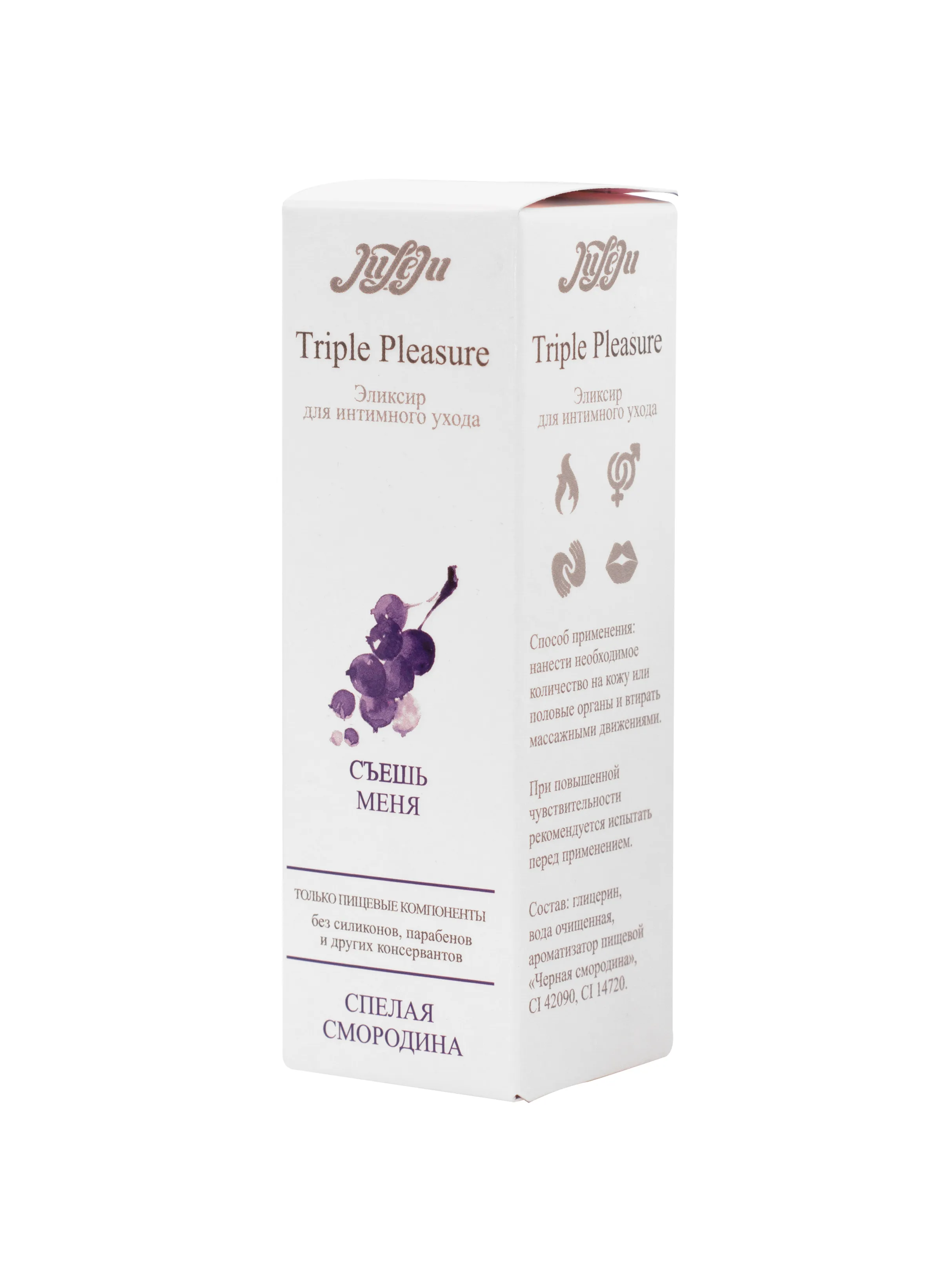 Эликсир для интимного ухода "Спелая Смородина" раскроет всю чувственность прикосновений, погружая в водоворот сладкой неги. Эликсир прекрасно подходит для чувственного массажа и обеспечивает длительное скольжение в качестве интимного лубриканта. Согревающий эффект раскрывается в полной мере под воздействием дыхания и поцелуев. Подходит для всех видов интимных ласк. Не содержит парабенов и других консервантов, в состав эликсира входят только пищевые компоненты. Состав: вода очищенная, ароматизатор пищевой “Черная смородина”, CI 42090, CI14720. Упаковка: картонная коробка с принтом. срок годности-2 года.