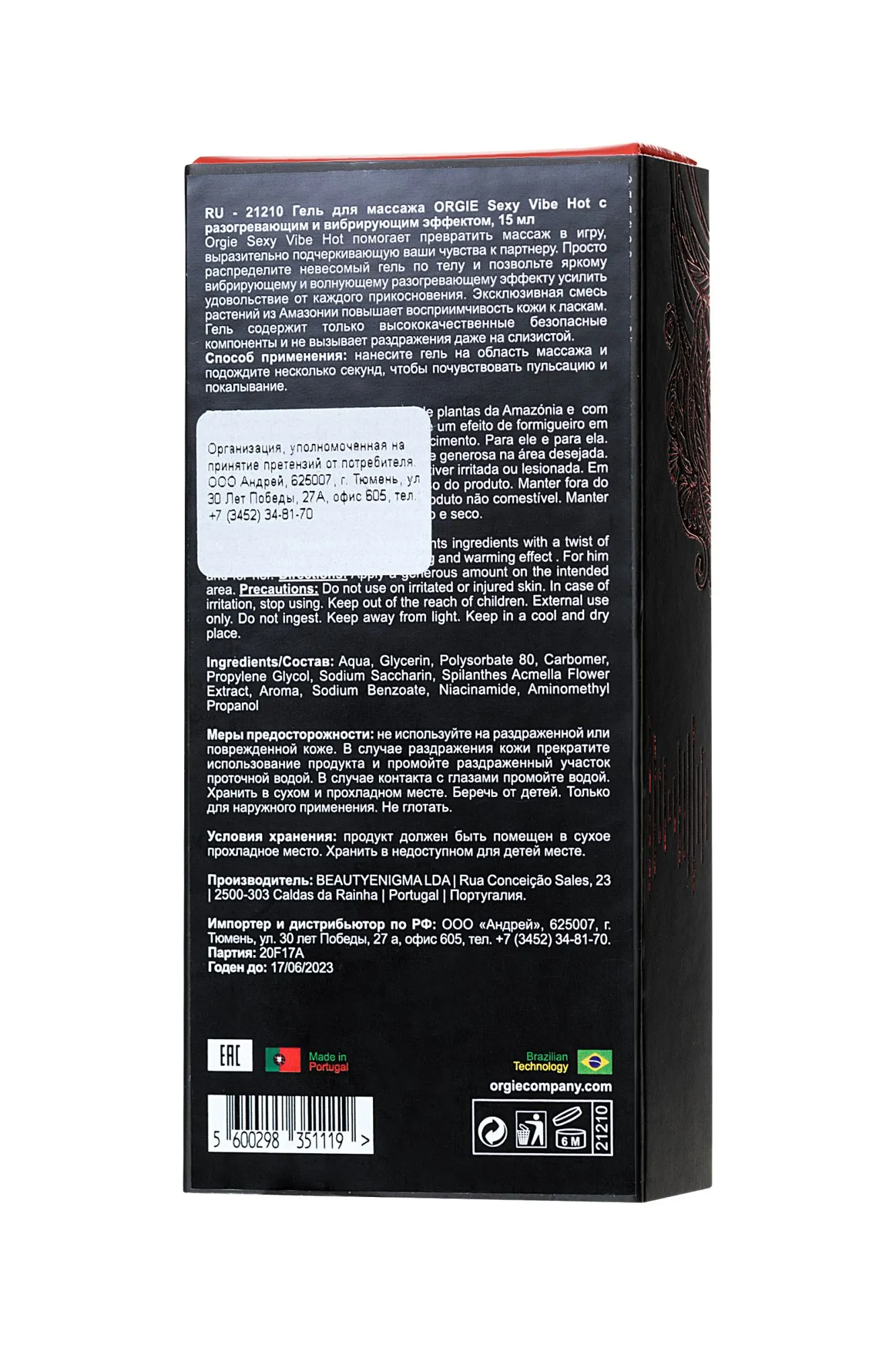Orgie Sexy Vibe Intense Orgasm помогает превратить массаж в игру, выразительно подчеркивающую ваши чувства к партнеру. Просто распределите невесомый гель по телу и позвольте яркому вибрирующему и волнующему разогревающему эффекту усилить удовольствие от каждого прикосновения. Эксклюзивная смесь растений из Амазонии повышает восприимчивость кожи к ласкам. Гель содержит только высококачественные безопасные компоненты и не вызывает раздражения даже на слизистой. Способ применения: нанесите гель на область массажа и подождите несколько секунд, чтобы почувствовать пульсацию и покалывание.