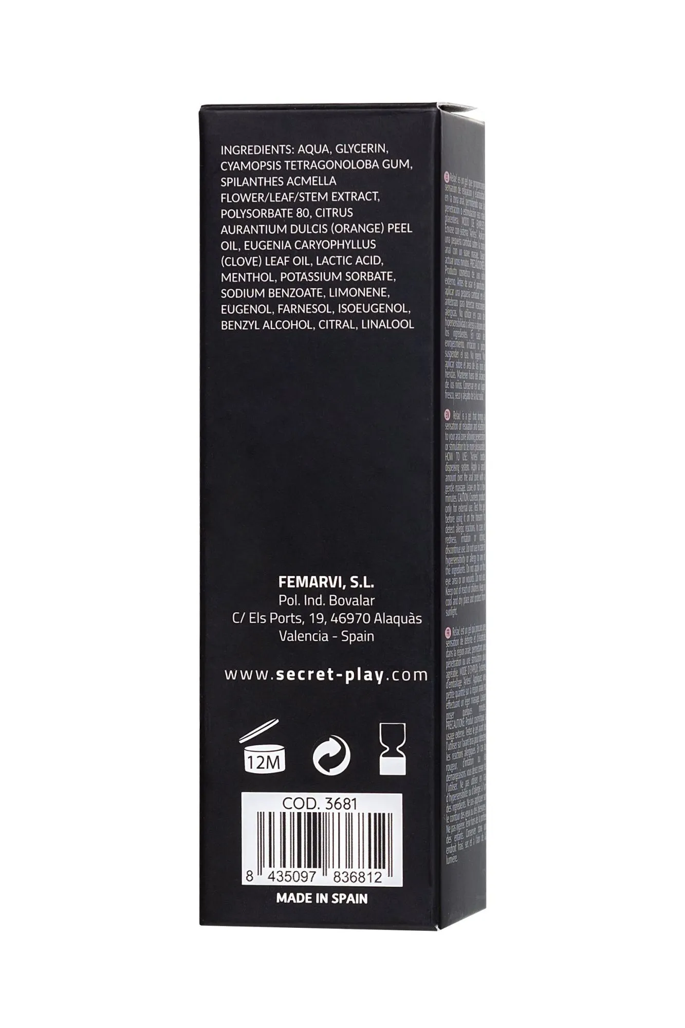 Анальный гель RELAX! ANAL GEL 15 ML Анальный секс – это одна из самых приятных сексуальных практик. Но чтобы насладиться этим процессом в полной мере необходимо расслабиться и возбудиться. Анальный гель RELAX! от Secret Play идеально дополнит интимную игру. Расслабься и получай удовольствие, новичок или опытный партнер – расслабление нужно всем. Гель имеет приятную текстуру, расслабляя и делая эластичными мышцы и ткани анального отверстия. Анальные ласки и проникновение становятся более приятными и возбуждающими. Нанесите небольшое количество геля на анальную область массирующими движениями, оставьте на несколько минут и приступайте к знакомству с новыми ощущениями от близости. Натуральные компоненты геля работают на расслабление, увлажнение и уход за нежными тканями ануса. Удобный флакон с дозатором, экономичный расход и эффективное расслабление – этот гель RELAX! ANAL GEL 15 ML не оставит вас равнодушным. Насладитесь анальными ласками без ограничений. Емкость с дозатором Объем: 15 мл. Простота использования Страна бренда Испания Ингредиенты: вода, глицерин, камедь Cyamopsis Tetragonoloba, экстракт цветов / листьев / стеблей Spilanthes Acmella, полисорбат 80, масло кожуры цитрусовых Aurantium Dulcis (апельсин), листья Eugenia Caryophyllus (гвоздики) Масло, молочная кислота, ментол, сорбат калия, бензоат натрия, лимонен, эвгенол, фарнезол, изоэвгенол, бензиловый спирт, цитраль, линалоол. Меры предосторожности: Косметический продукт только для наружного применения. Не используйте при гиперчувствительности или аллергии на какие-либо ингредиенты. В случае раздражения прекратить использование. Не наносите на глаза или на раны. Не съедобен. Храните в недоступном для детей месте. Держите в прохладном, сухом месте, вдали от солнечных лучей.