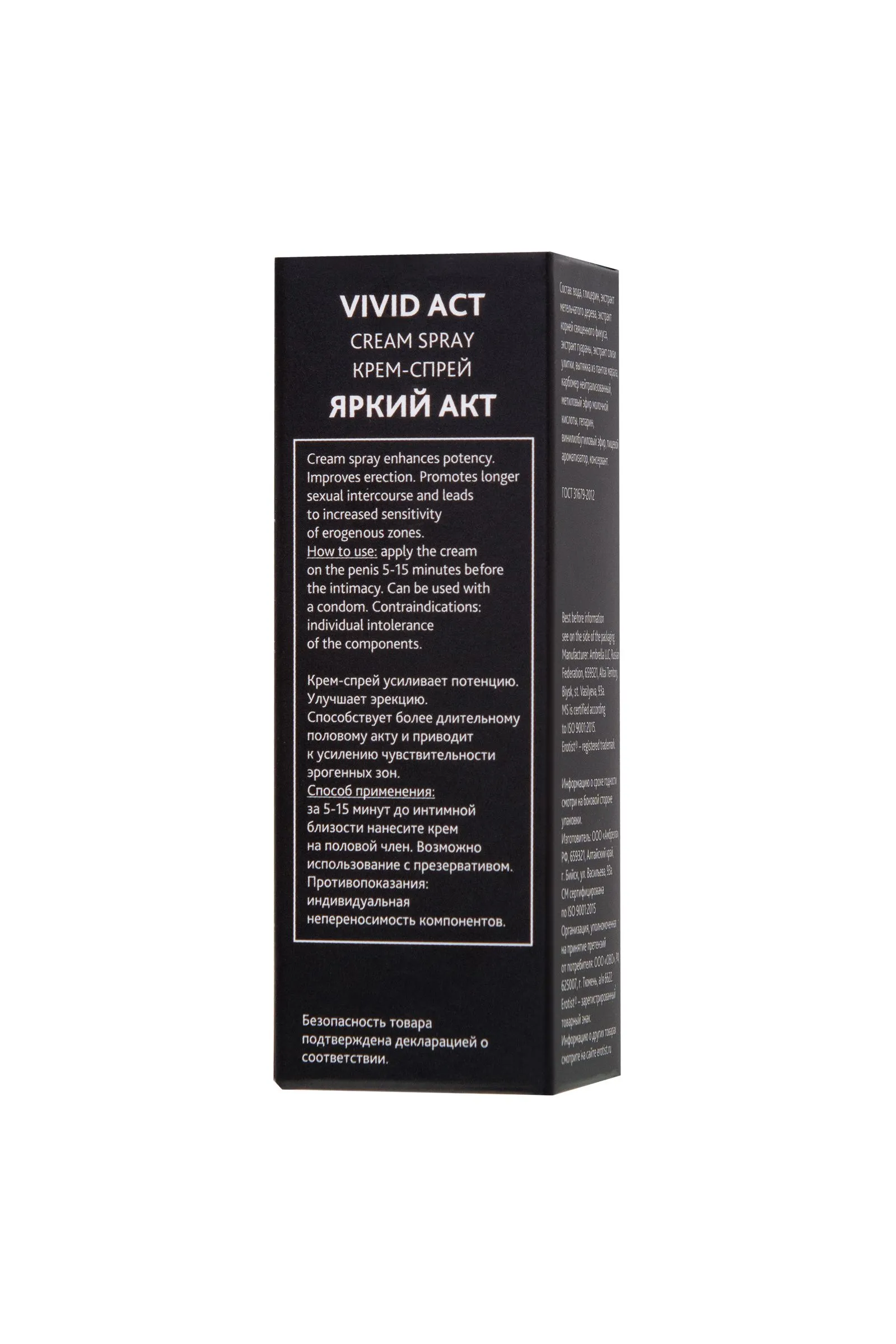 Для раскрытия сексуального потенциала в полной мере воспользуйтесь эффективным возбуждающим крем-спреем для мужчин Vivid Act. Средство увеличивает длительность полового акта и является оптимальным дополнением для организации страстного соития. Возбуждающий и стимулирующий спрей помогает настроиться на нужный лад, снять усталость, придать необходимую уверенность в своих силах и разнообразить игры в постели. Возбуждение достигается за счет сбалансированной активной растительной формулы, путем наполнения кровью тканей полового члена и эрогенных зон, что многократно увеличивает чувствительность и обостряет влечение. Эффективные компоненты средства благодаря активной мицеллярной форме: быстро всасываются в кровь способствуют стабилизации эрекции и ускорению кровообращения повышают эластичность тканей, благодаря чему увеличивается размер полового органа придают чувствительность за счет приливов крови к органам малого таза повышают либидо и потенцию продлевают продолжительность полового акта, яркость и силу оргазма. Гель-спрей Vivid Act способствует: улучшению циркулирования крови в пенисе стимуляции нервных окончаний головки полового члена мужчины увеличению чувствительности усилению способности восприятия сексуальных стимулов продлению сексуального контакта Рекомендации по применению: за 5-10 минут до полового акта нанести спрей на пенис во время сексуального стимулирования, что позволит сделать приятнее любой сексуальный контакт и подарит партнерам чувственную прелюдию. Возможно использование с презервативом. Не содержит гормонов, не вызывает привыкания. Основные действующие компоненты: Экстракт метельчатого дерева оказывает возбуждающее воздействие, усиливает влечение к партнерше. Способствует улучшению кровоснабжения в органах малого таза, усилению эрекции, значительно увеличивая время интимного акта. Экстракт корней священного фикуса способствует улучшению кровотока в мужском достоинстве и усилению эрекции. За счет растяжения пещеристых тел полового органа кровью, происходит некоторое его увеличение в длину и ширину. Экстракт гуараны рекомендуется для достижения эрегированного состояния члена, оказывает тонизирующий эффект, придает дополнительные силы и энергию и повышает сексуальную силу мужчины. Экстракт слизи улитки способствует повышению продуцирования тестостерона, возбуждению на эмоциональном и физиологическом уровне, улучшению процесса усвоения полезных для мужского здоровья витаминов. Вытяжка из пантов марала повышает уровень гормонального фона у мужчин, способствует быстрому восстановлению сперматогенеза, прекрасно стабилизирует половую функцию. Карбомер - вещество гелевой структуры, обладает увлажняющим действием, увеличивает время абсорбции активных компонентов, повышая эффективность средства. Метиловый эфир молочной кислоты – сенсорный агент, способствует возбуждению и продлению полового акта. Также является мощным активным ингредиентом с эффектом охлаждения кожи и слизистых. При продолжающемся воздействии метилового эфира молочной кислоты на кожу и слизистые полового члена происходит определенное снижение чувствительности головки пениса и увеличение времени пенетрации. Гепарин способствует усилению эрекции и увеличению продолжительности полового акта.