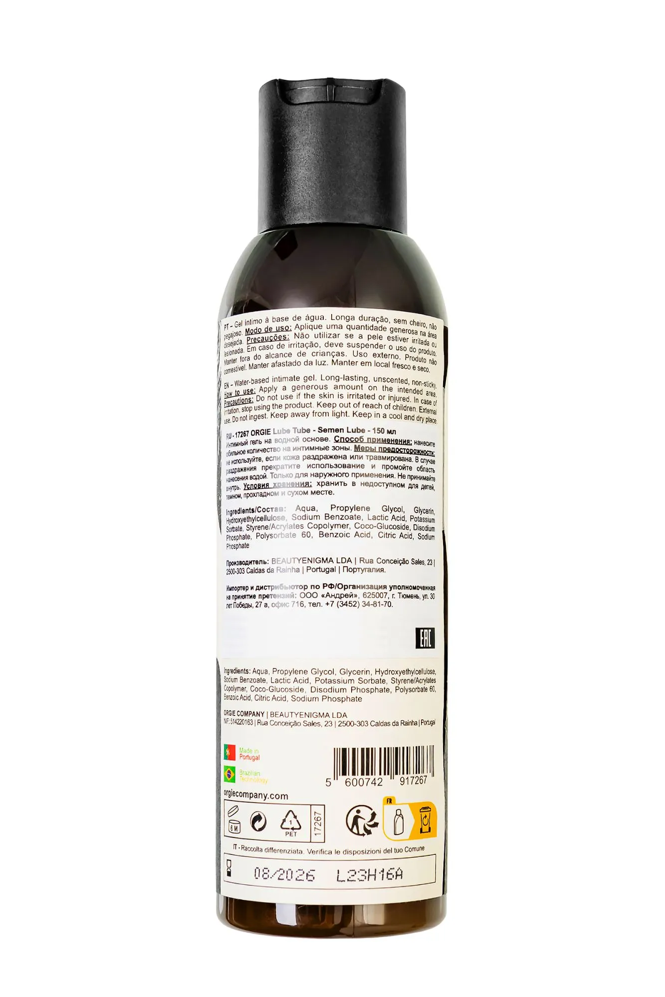Lube Tube Semen Lube от Orgie — это не просто гель-лубрикант на водной основе, это настоящее открытие в мире интимных продуктов. Что делает его уникальным? Гладкий лубрикант для интимной гигиены имитирует цвет и текстуру спермы. Молочный, кремовый и густой, он обеспечивает ультра-скользящие и длительные ощущения, которые создают удивительно реалистичный эффект, полностью повторяя естественное ощущение. Инновационная формула обеспечивает ультра-скольжение, погружая вас в мир интимной роскоши. Наносится легко и не оставляет следов, оставляя вас с нежным и увлажненным ощущением. Цвет и текстура: Максимальный комфорт и удовольствие, благодаря гладкой текстуре и мягкому, кремовому оттенку, идеально имитирующим натуральную сперму. Долговечность: Обеспечивает длительное скольжение, ощущение максимального комфорта и наслаждения. Легкая смываемость: Быстро и легко очищается и стирается, не оставляя следов липкости. Способ применения: Нанесите достаточное количество геля на нужную область. Повторите при необходимости. Orgie – это не просто бренд интимной косметики, это бразильский гимн любви и наслаждению. Продукция Orgie, созданная с использованием натуральных афродизиаков и инновационных формул, пробуждает чувственность и дарит незабываемые ощущения как в интимной близости с партнером, так и в сольном путешествии к самопознанию. Orgie – это философия, призывающая ценить и исследовать все грани интимности, делая каждый момент незабываемым.