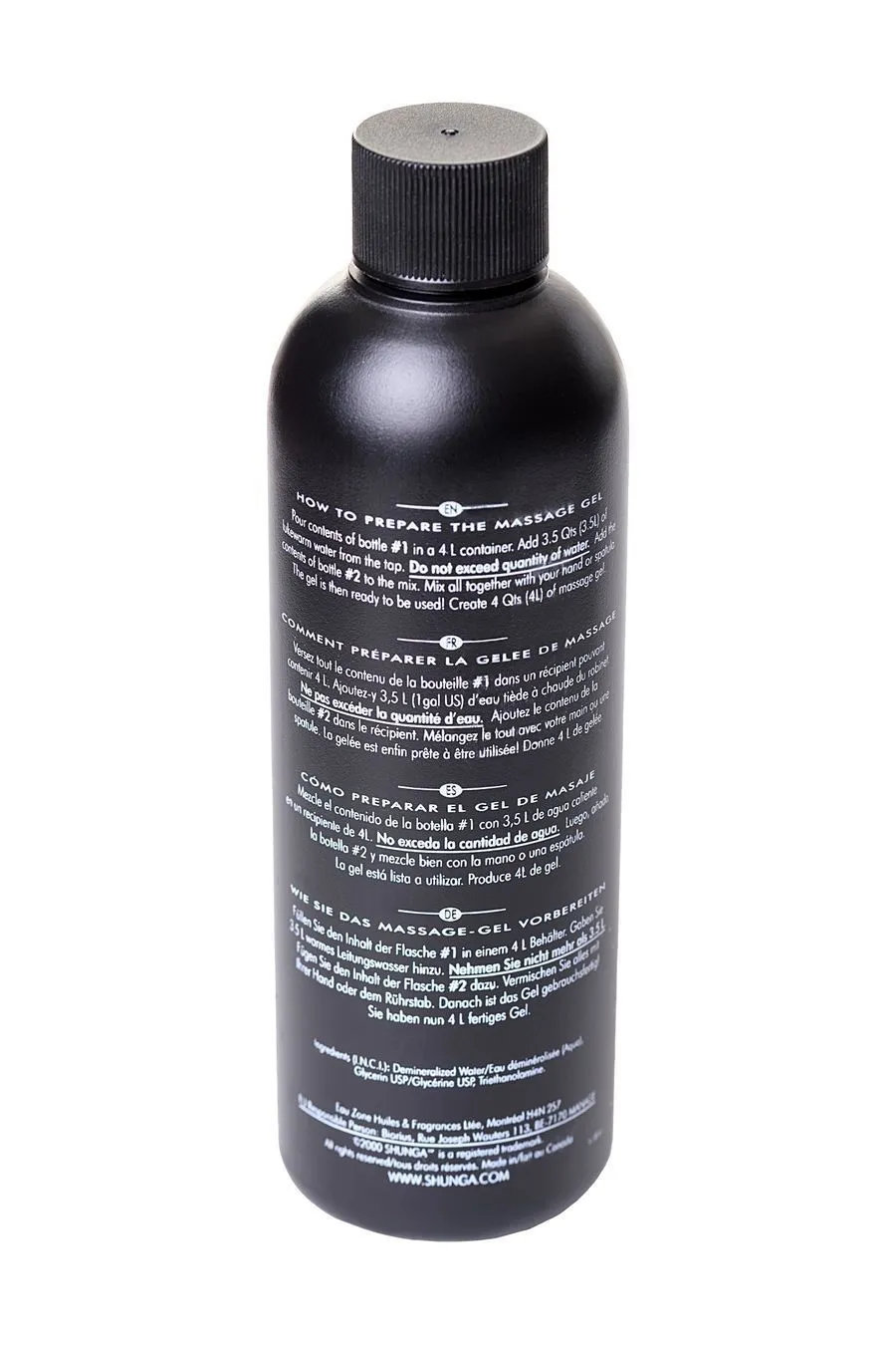 Приготовление геля: Налейте 3,5 литра теплой воды и содержимое бутылочки №1 в любую емкость. Добавьте бутылочку №2 и хорошо перемешайте. Вы получите 4 литра массажного геля.