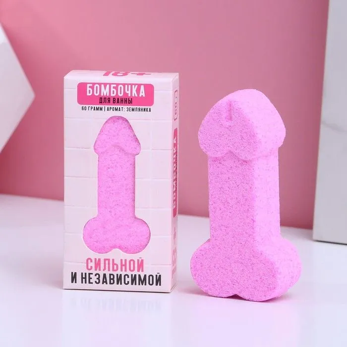 Бурлящая бомбочка в виде члена разнообразит прием ванны. Сувенир в виде мужского достоинства 8 см в длину и весом 60 г взбудоражит фантазию, а сладкий аромат подарит приятные ощущения.