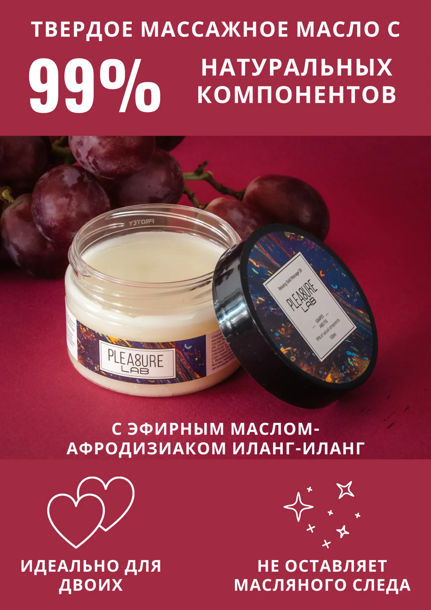 Pleasure Lab Relaxing с ароматом винограда и инжира, а также эфирным маслом-афродизиаком иланг-иланг способно не только создать волнующую, романтическую атмосферу, но и нежно расслабить тело партнера. Способ применения: разотрите небольшое количество масла в ладонях и медленно начните продвигаться массирующими движениями от ступней к спине и плечам партнера. Подходит для самомассажа. Состав: масло ши (карите), миндальное масло, масло виноградных косточек, масло кокосовое, пчелиный воск, масло семян инжира, парфюмерная композиция, эфирное масло иланг-иланг, СК-СО2 экстракты (розмарин, лимон, облепиха, календула), натуральный антиоксидант (токоферол (смесь), бета-ситостерол, сквален), витамин Е. Срок годности- 2 года.