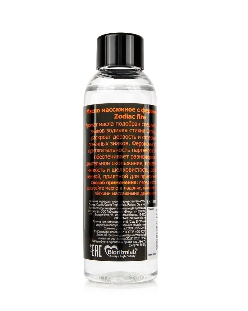 Массажное масло Zodiac Fire откроет мир чувственности и страсти, внесёт нотку пикантности и разнообразит интимную жизнь! Его аромат подобран в тандеме с астрологами специально для знаков зодиака стихии Огонь - Овен, Лев, Стрелец.