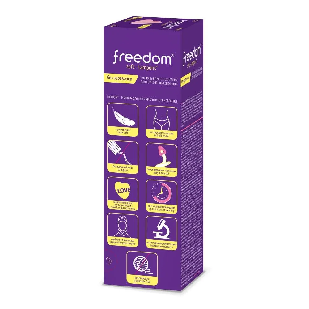 100% безопасный медицинский материал, разработанный для тампонов Фридом экспертным советом в Германии, не пересушивает слизистую и не травмирует ткани при введении и извлечении. Материал тампонов FREEDOM не увеличивается в размерах при впитывании. Вот прочему FREEDOM - это комфортные тампоны для секса и спорта, купания и активного образа жизни. Купание с тампоном, тренировки, фитнес и даже секс с тампоном – теперь ничто не помешает!