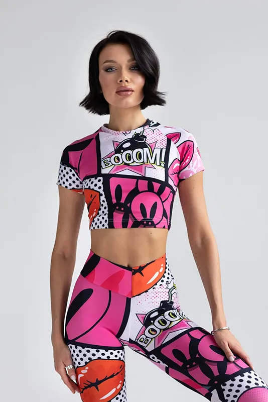 Брендированный кроп-топ от Pink Rabbit с ярким оригинальным принтом. В нём вы точно не останетесь без внимания и привлечёте множество заинтересованных взглядов. Выполнен из удобного и эластичного материала, подходит для занятия спортом, но так же можно использовать в повседневном гардеробе с аксессуарами.