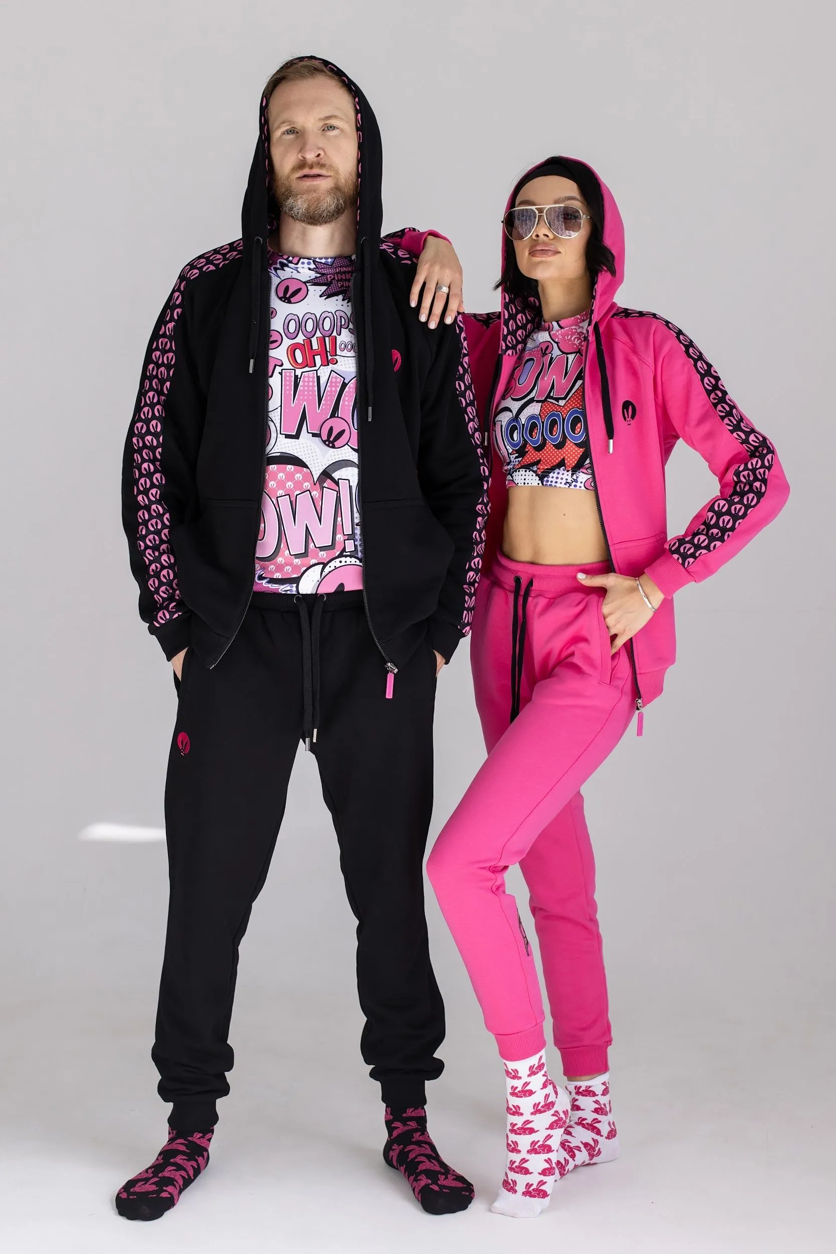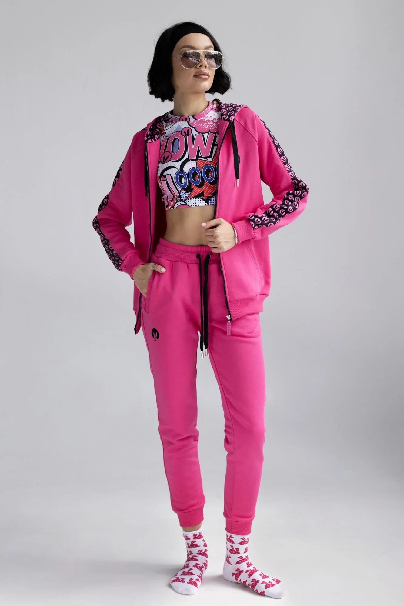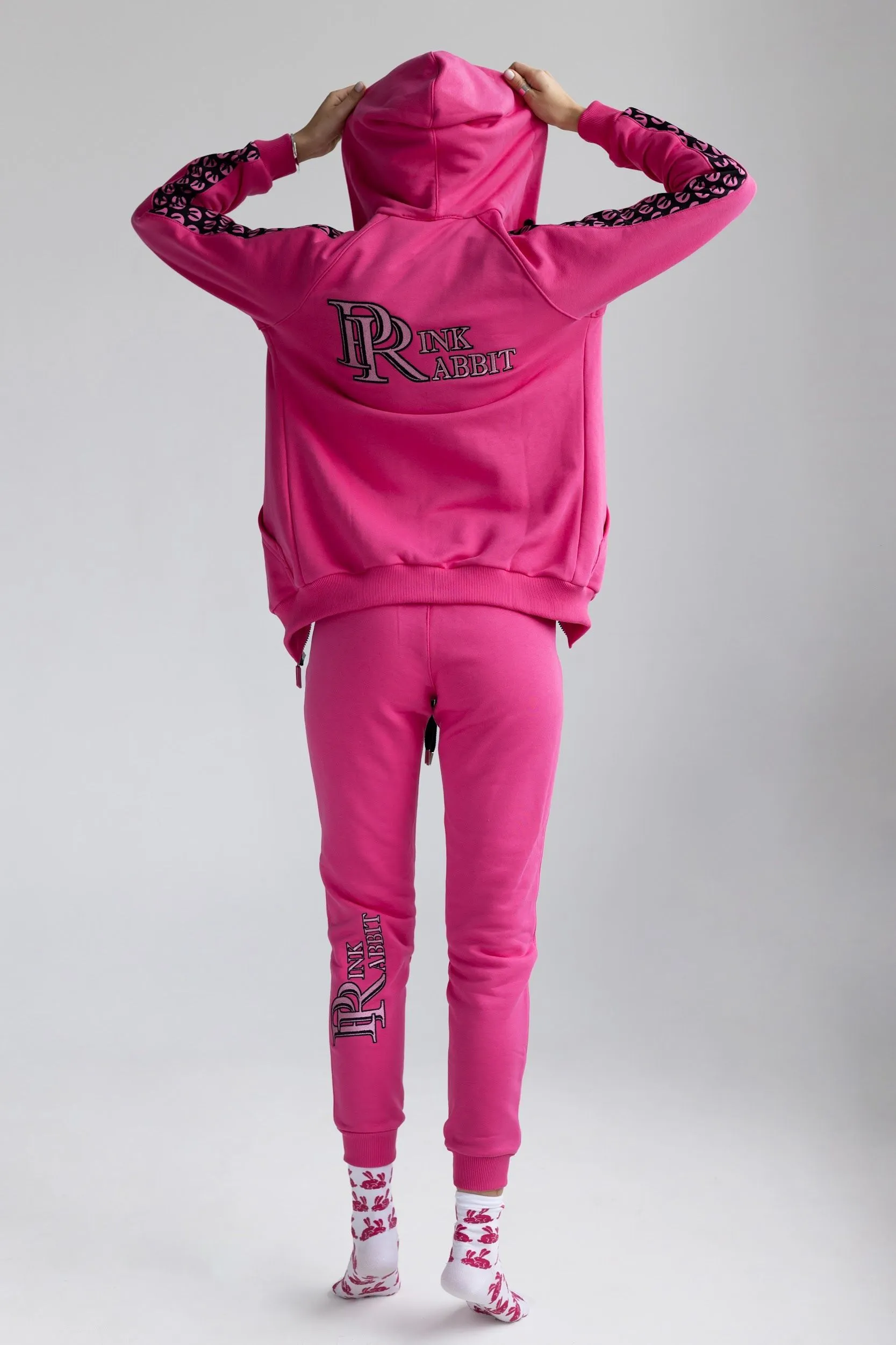 Розовый спортивный женский костюм от Pink Rabbit выполнен из хлопкового футора. Костюм состоит из бомбера и брюк. Подходит как для пробежки в парке, так и для расслабленного отдыха. А если добавить аксессуары и туфли на каблуке, то можно смело отправляться в нём на вечеринку.