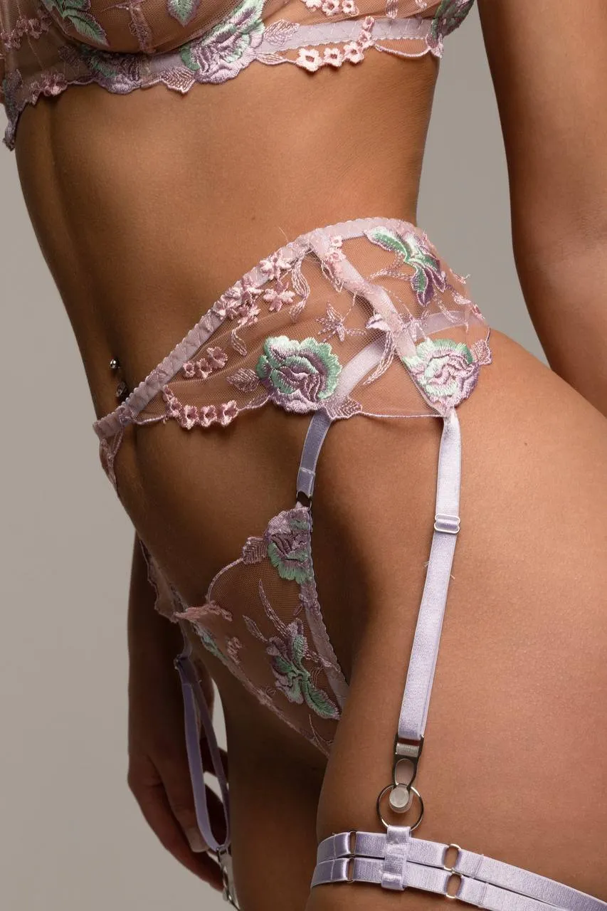 Роскошный и утонченный комплект нижнего белья Linda из сетки с вышивкой в лавандовом цвете. В комплекте: бюстгальтер, трусики, пояс с гартерами и чокер.