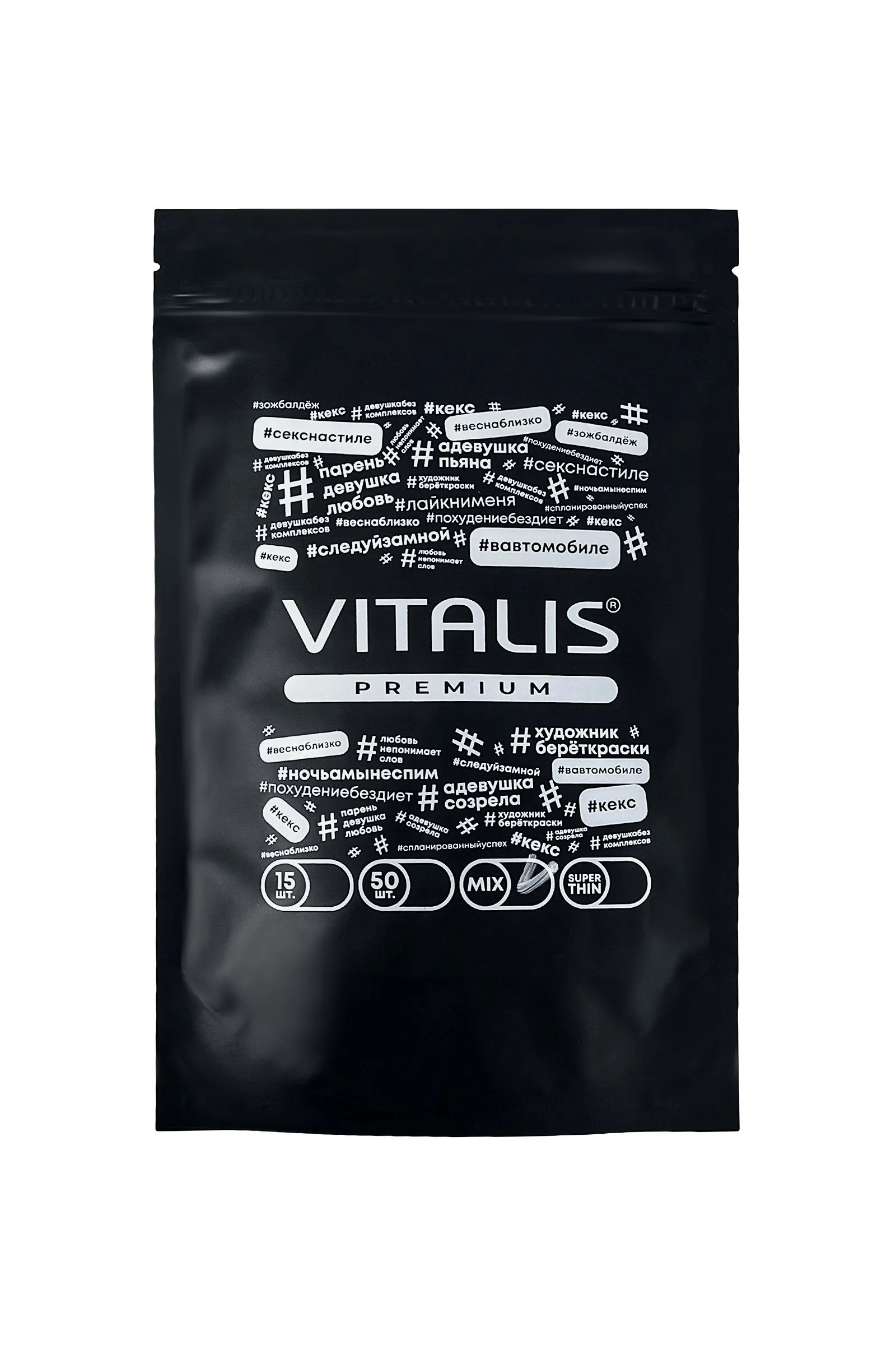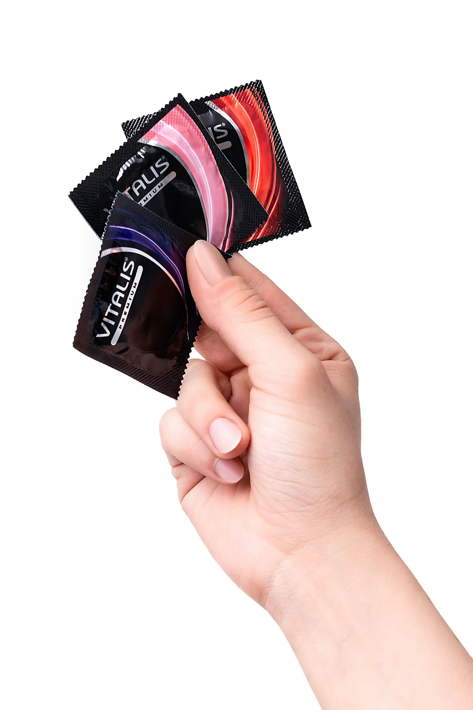 Презервативы VITALIS MIX pack. В одной упаковке микс из 11 видов презервативов: ультратонкий, с пупырышками (стимулирующие с точками и кольцами), цветной с ароматом шоколада, цветной с ароматом клубники, цветной с ароматом банана, анатомической формы, охлаждающий, классический, ребристый, сверхпрочный, увеличенного размера 57мм. Тонкие презервативы VITALIS с обильным количеством смазки - это стандарт немецкого качества. Прочные презервативы обеспечивают надежную защиту от заболеваний передающихся половым путем и от нежелательной беременности. Контрацептивы стандартного размера из натурального латекса с мягкой смазкой на силиконовой основе не вызывает аллергических реакций и способствует большему удовольствию. Сет презервативов VITALIS Mix разработан специально для тех, кто хочет получать от сексуальной жизни все и даже немного больше! Разнообразие выбора дает возможность пробовать для себя новые ощущения.Дайте волю своей фантазии!VITALIS PREMIUM - доверяя, получай удовольствие! Ширина: 53mm Длина: 180mm Толщина: 0.07mm Смазка: силикон Форма: цилиндрическaя Качество: ISO 4074:2002