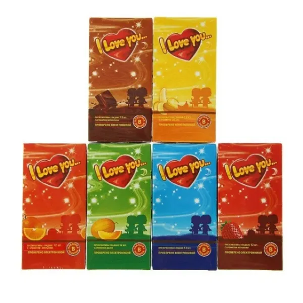 Презервативы I Love You. Яркая упаковка, узнаваемый дизайн. Шесть разных ароматов под любое настроение и наклейка-подарок в упаковке с признаниями в любви на разных языках мира. Гладкие презервативы нового поколения в силиконовой смазке с накопителем.