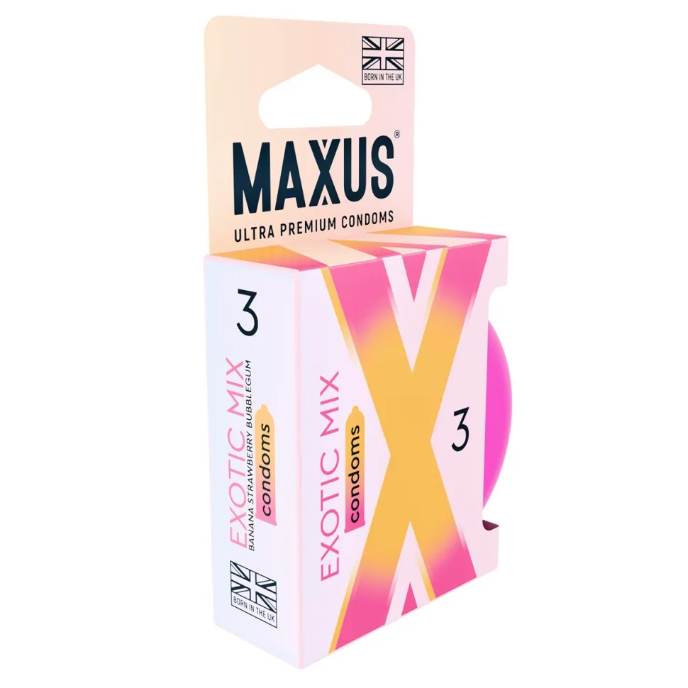 MAXUS Exotic Mix — для тех, кто любит разнообразие и никогда не отказывается от«сладенького». Три разных цвета и аромата (банан, клубника и бабл-гам).Презервативы гладкие цветные иароматизированные (банан - желтый,клубника - красный, бабл-гам - синий).Позволят побаловать себя экзотическимиароматами. Выполнены из высококачественного латекса, имеют классическую форму, в силиконовой смазке. В комплекте кейс для хранения. Номинальная ширина - 53 мм. Толщина стенки - 0,06 мм. В упаковке - 3 шт.