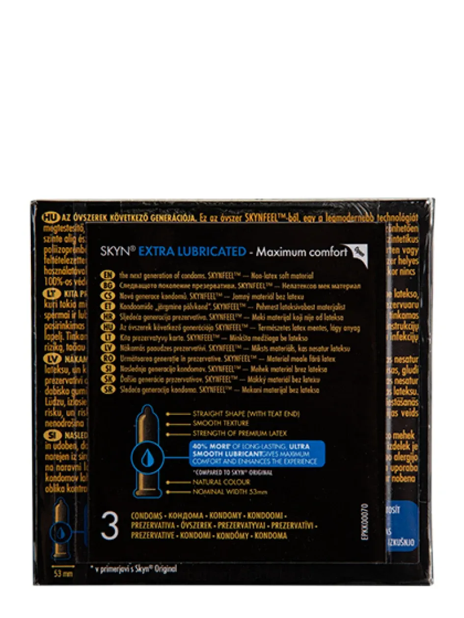 Презервативы SKYN Extra Lube содержат на 40% больше долговечной и ультрагладкой смазки, чем наши стандартные презервативы. Это новое поколение презервативов изготовлено из SKYNFEEL - технологически передового материала без латекса, доказавшего свою способность усиливать стимуляцию. Он настолько мягок и удобен, что вы практически не заметите, как наденете его, позволяя вам и вашему партнеру по-настоящему почувствовать все. Номинальная ширина 53 мм На 40% больше нашего лубриканта на силиконовой основе Натуральный цвет. Без латекса.