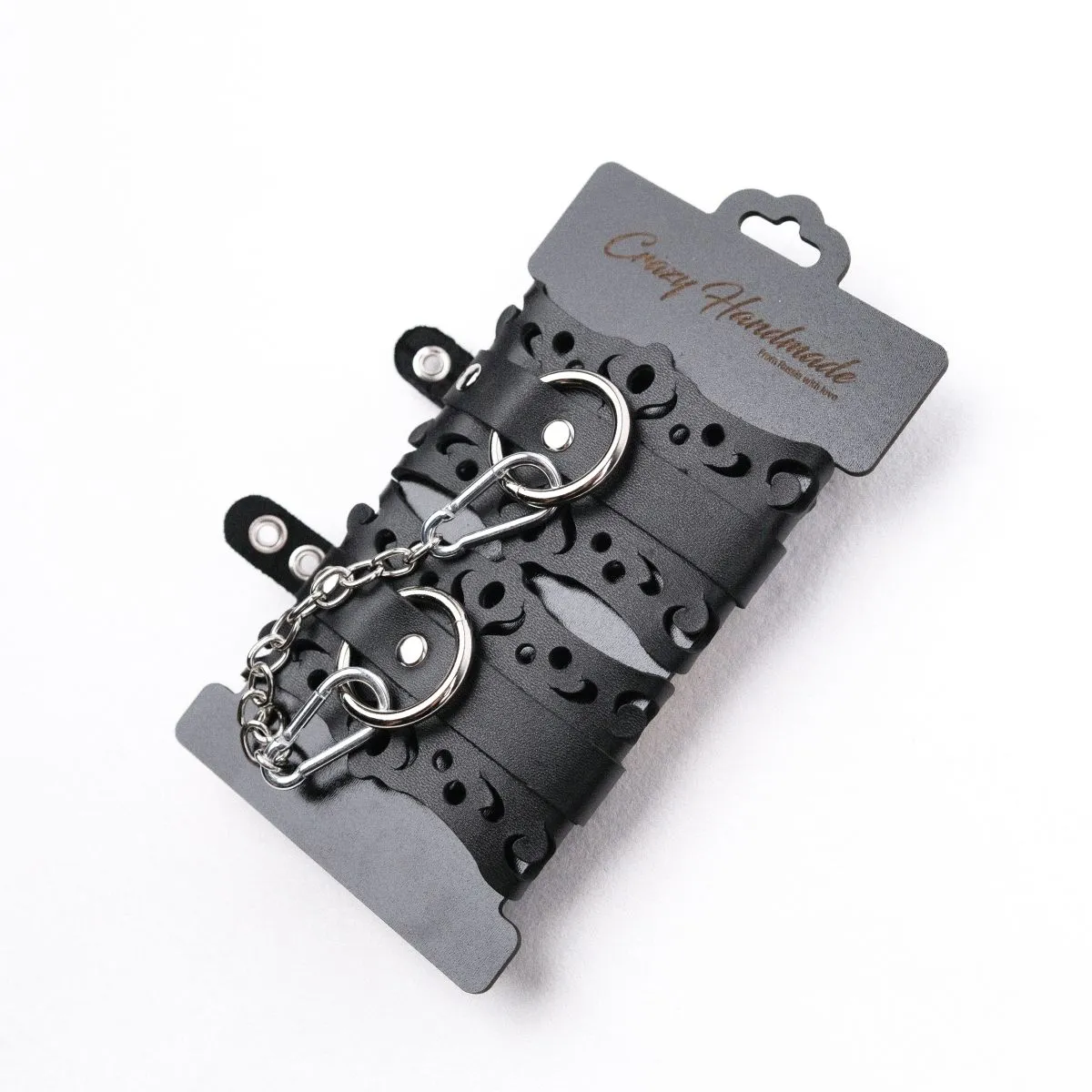 Элегантные наручники из натуральной кожи в глубоком черном цвете. Узоры придают утонченности и легкости даже такому аксессуару. Отличный спутник для игр с доминированием!