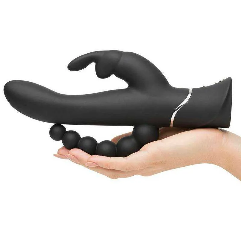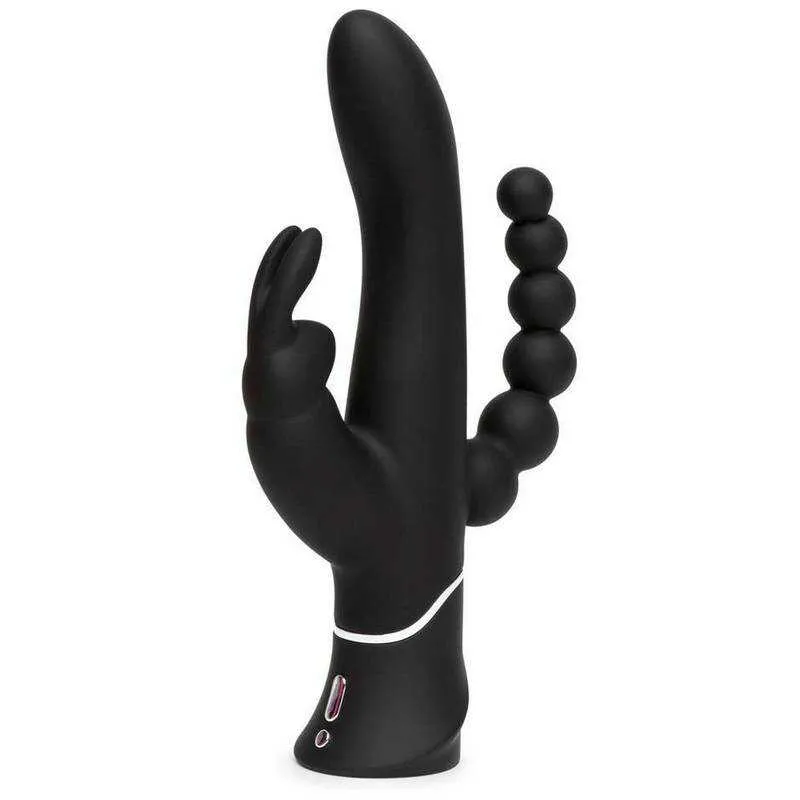 Вибратор Happy Rabbit Triple Curve Vibrator имеет прямой гладкий ствол для проникновения во влагалище, с несколько изогнутой, наклоненной в сторону головкой. Сбоку расположен длинный отросток, составленный из шести шариков различного диаметра, напоминающий классические анальные бусы. Втулка предназначена для анальной стимуляции, которая дополняет вибромассаж вагины. Еще один крупный отросток в виде головы кролика с ушками предназначен для массажа клитора и еще больше усиливает возбуждение, доводя женщину до полной потери самообладания.