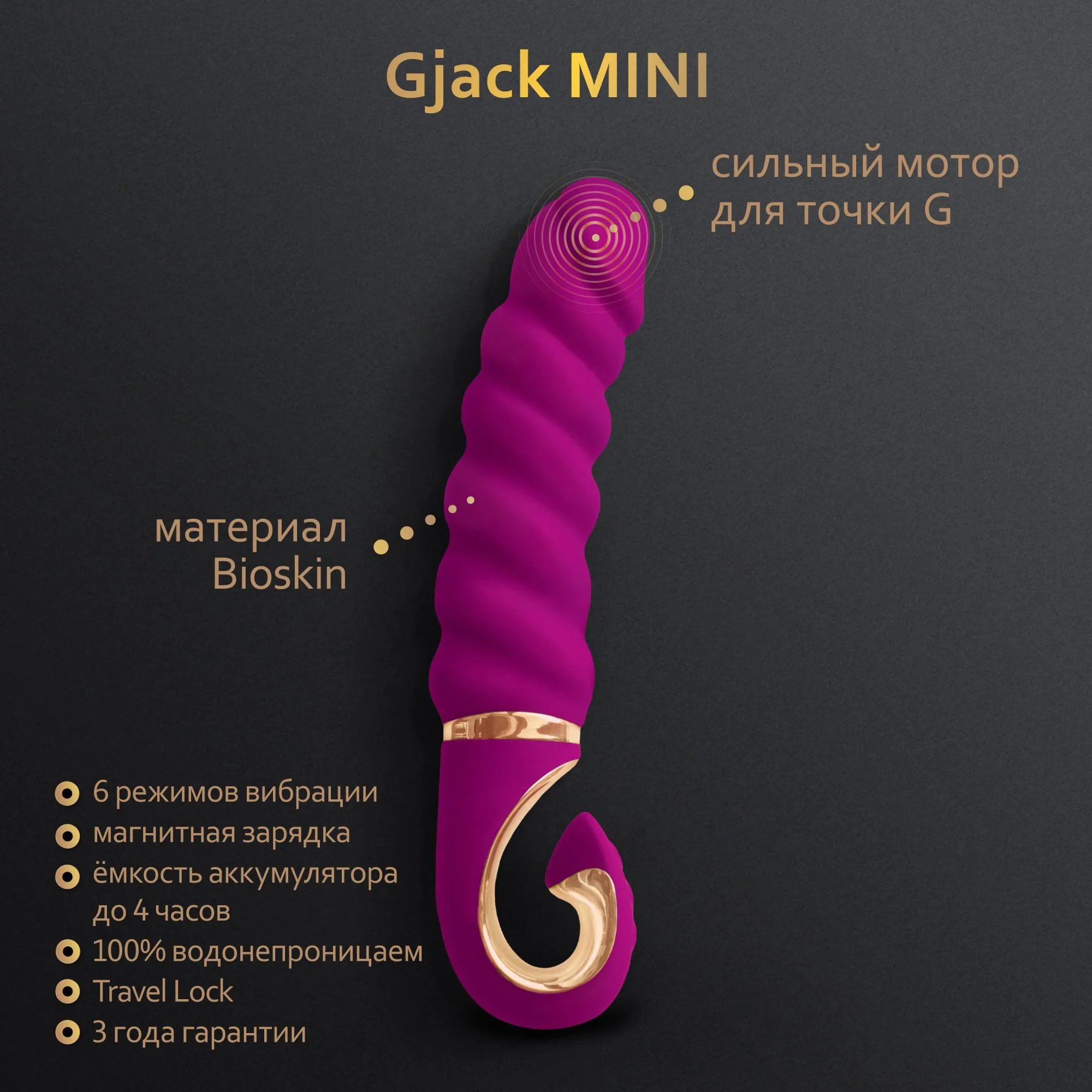 GJaсk Mini от знаменитых великобританцев Gvibe. Все тот же невероятный материал Bioskin, это премиум-класс среди материалов игрушек! Очень мощный, но тихий мотор и шесть режимов вибрации с изменяемой интенсивностью - от легкой, дразнящей, до сильных оргазмических толчков - его вибрация проходит по всей длине ствола...