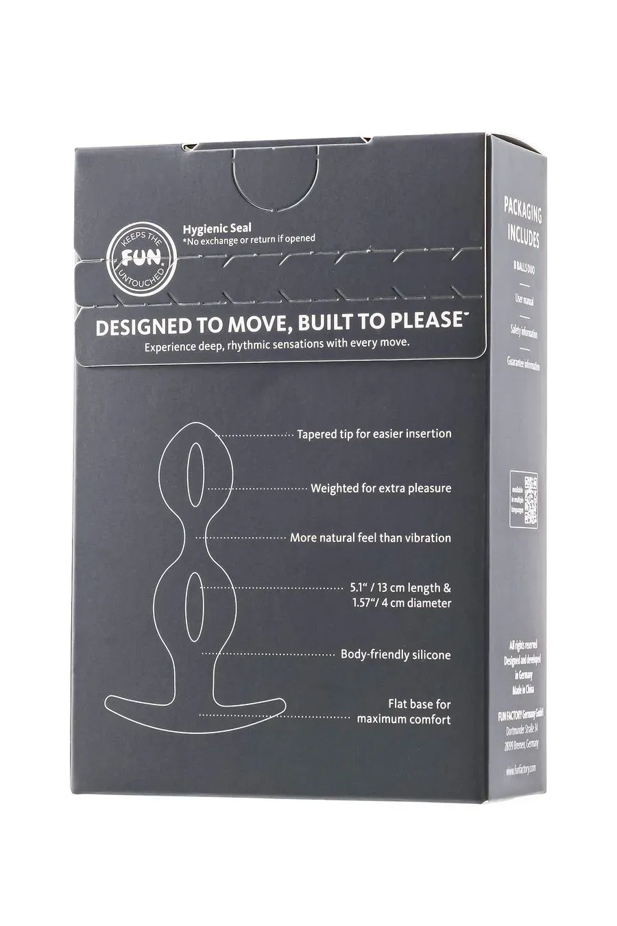 B BALLS DUO предлагают идеальное сочетание удовольствия и мощной стимуляции. Два сферических грузика создают интенсивное движение, которое ощущается более естественно, чем обычные вибрации, а плоское основание обеспечивает оптимальный комфорт. Играете ли вы вместе или носите их незаметно в течение дня, эти шарики подойдут вам. Заостренный кончик обеспечивает легкое введение, поэтому вы можете полностью сосредоточиться на удовольствии. Просто добавьте немного смазки на водной основе, чтобы усилить ощущения!