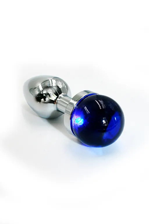 Анальная пробка из аллюминия размер S. Длина - 6 см, диаметр - 2,8 см, вес в 85 грамма. Изделие дополнено выпуклым украшением из стекла сферической формы голубого цвета. Упакована в вельветовый мешочек для хранения.