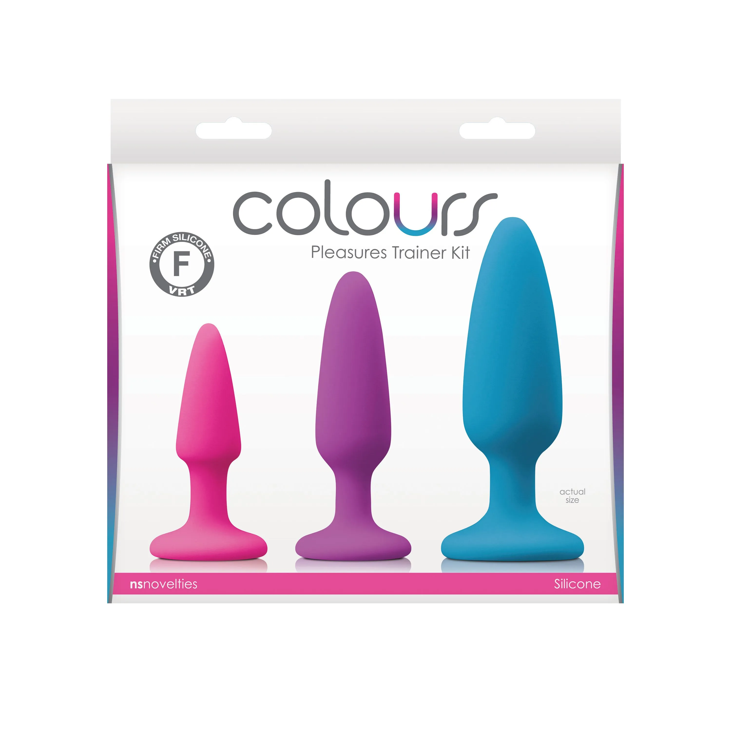 Набор  Colours Pleasures Trainer Kit состоит из трех пробок различного размера, которые подойдут как новичкам, так и опытным любителям анальных ласк. Все пробки выполнены в конической форме и обладают зауженным кончиком, поэтому их введение будет максимально комфортным. Постепенное расширение пробок в диаметре обеспечит приятную стимуляцию и разработку мышц, а узкая шейка после самой широкой части пробки поможет удерживать ее на месте во время ношения. Широкое основание игрушек может служить как ограничитель. Все пробки выполнены из качественного медицинского силикона, они очень приятны на ощупь и достаточно гибкие.