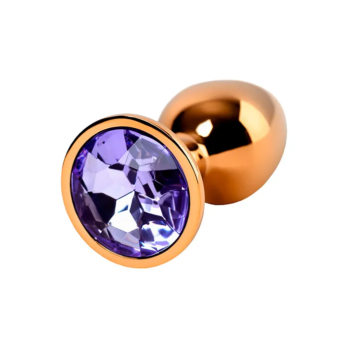 Металлическая блестящая золотистая анальная пробка от Pink Rabbit с переливающимся фиолетовым кристаллом в основании. Прелестная игрушка для разнообразия любовных игр и ласк.