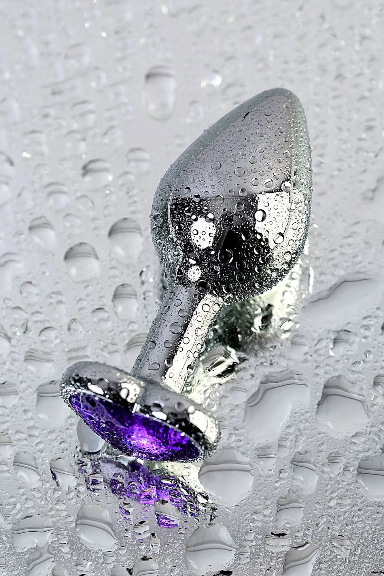 Серебристая анальная втулка из легкого сплава ощутима по форме, но комфортна по весу. Страз в форме сердечка цвета аметист украсит ваши игры.