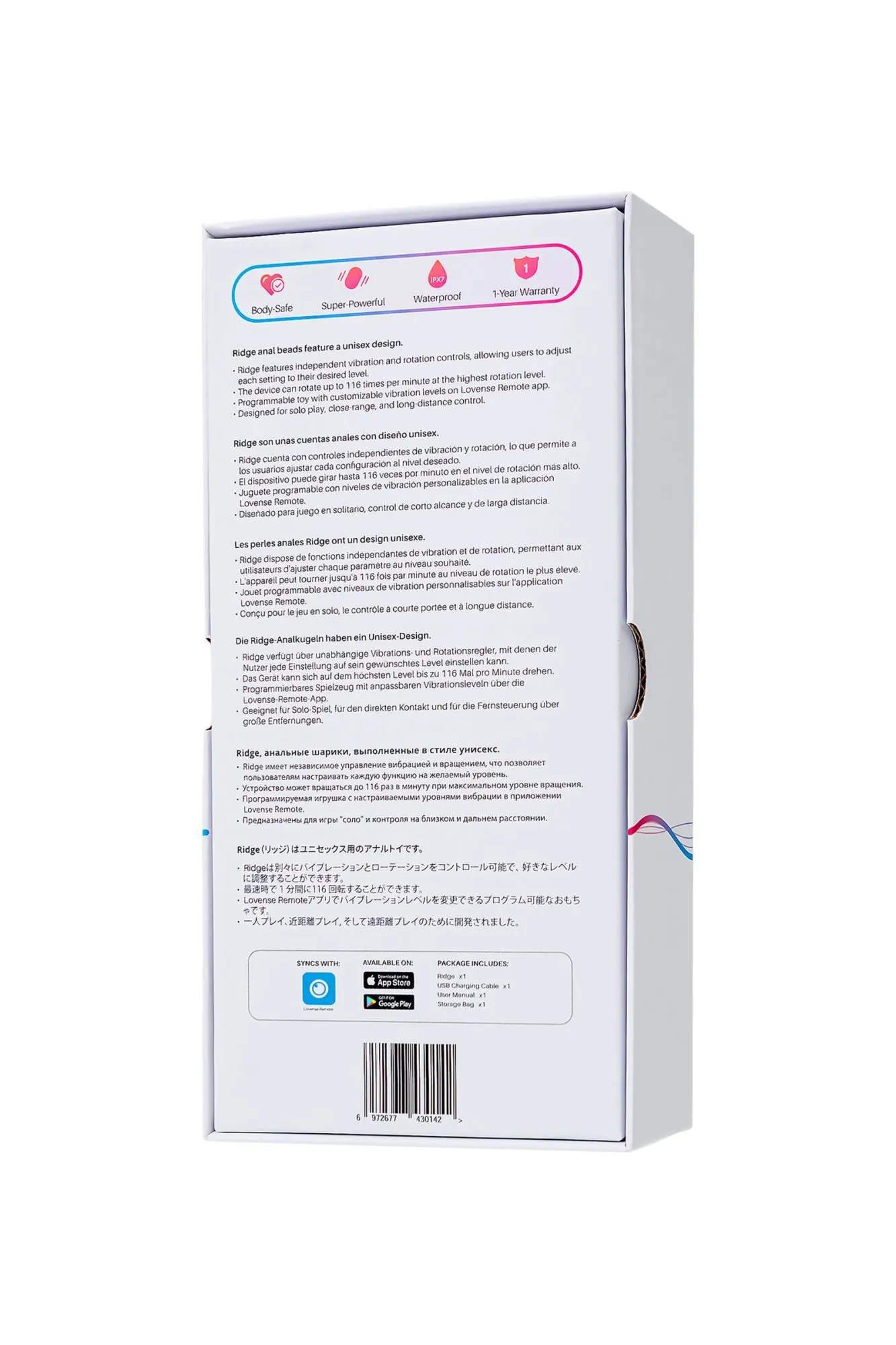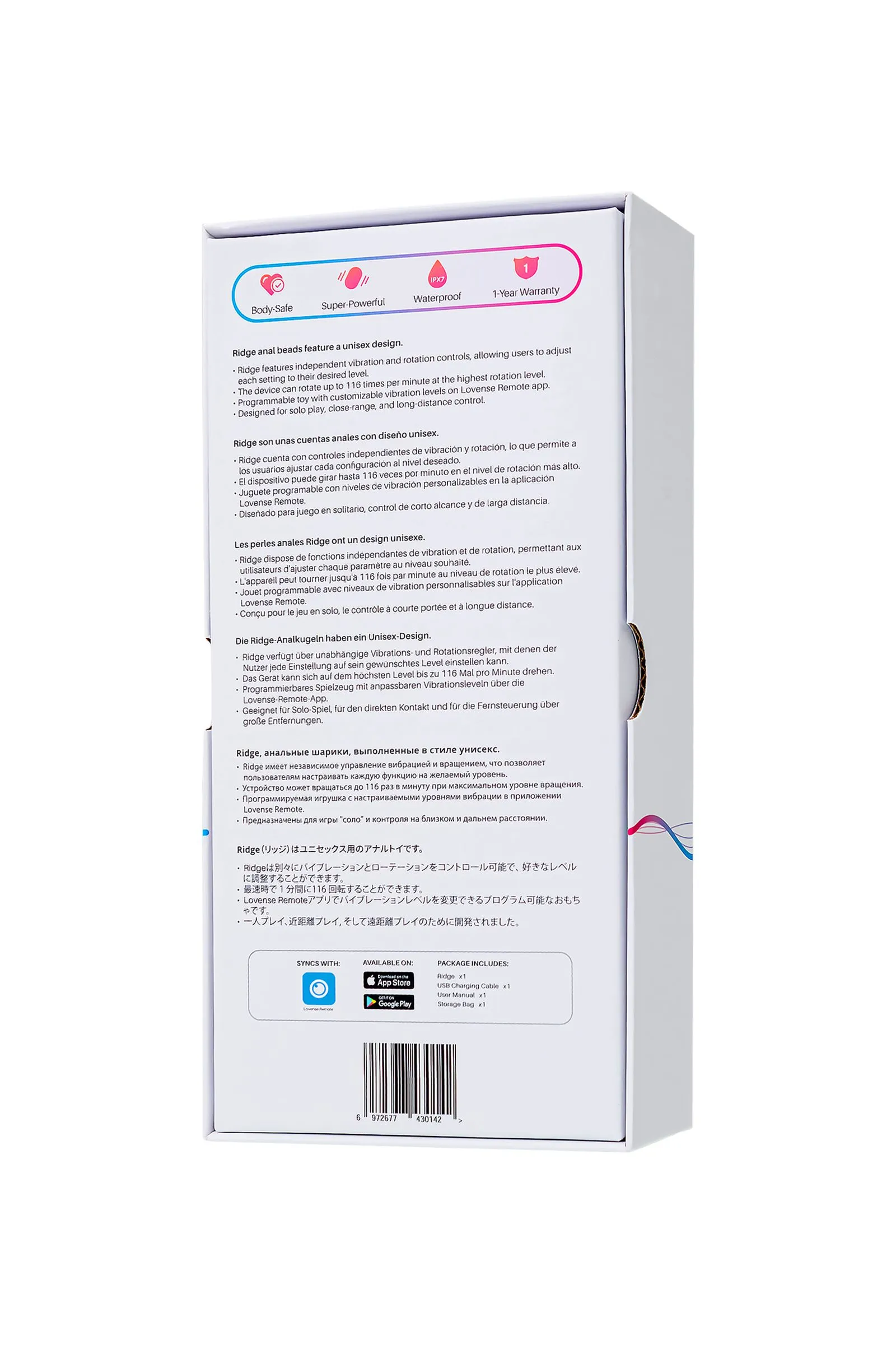 Добро пожаловать в мир новых анальных ощущений с вибрационными и вращающимися анальными шариками Ridge от Lovense! Эта удивительная игрушка призвана удовлетворить все ваши желания, независимо от вашего пола или уровня опыта. Сочетание глубокой вибрации с массажными движениями обеспечивает невероятные ощущения. Уникальный дизайн и передовые технологии Lovense делают Ridge совершенно непохожим на другие анальные игрушки. Ridge предлагает интенсивные вибрации и вращения с частотой до 116 оборотов в минуту. При этом управление функциями можно регулировать как вместе, так и по отдельности. Мощный мотор обеспечивает интенсивные вибрации при низком уровне шума, обеспечивая максимальную дискретность. Миниатюрные шарики легко вводятся и извлекаются, позволяя вам постепенно увеличивать уровень комфорта и уверенности. Диаметр шариков постепенно расширяется к основанию. Ridge также обеспечивает дополнительную стимуляцию эрогенных зон, увеличивая удовольствие. У мужчин стимуляция ануса и точки Р вызывает мощнейший оргазм, не сравнимый со стимуляцией полового члена. У женщин шарики предлагают непрямую стимуляцию точек G и А, усиливая кульминацию. Одновременное использование анальных шариков и интимное проникновение расширяет палитру ощущений. Гладкий вращающийся кончик легко вводится и обеспечивает объемный массаж на 360°. Гибкое нижнее соединение позволяет вам наслаждаться игрой в любой позе. Игрушка безопасно и надежно фиксируется благодаря эргономичному широкому основанию, предотвращающему полное погружение игрушки в тело. С помощью приложения Lovense Remote вы можете расширить границы ваших анальных игр, управляя Ridge на расстоянии. Неограниченные паттерны вибрации, звуковая активация, синхронизация с музыкой и многое другое – Ridge предлагает множество возможностей для экспериментов и наслаждения. Совместимость с различными устройствами обеспечивает легкость подключения. Экспериментируйте с анальной игрушкой соло или с партнером. Ridge обладает высоким уровнем безопасности и комфорта. Изготовленный из 100% высококачественного силикона, он доставит вам удовольствие безопасно для вашего тела. Кроме того, Ridge водонепроницаем (IPX7) и легко моется, что делает его идеальным компаньоном для использования в ванне или душе. Не упустите возможность обогатить свою интимную жизнь с Ridge от Lovense – лучшими вибрационными и вращающимися анальными шариками с управлением через приложение. 7 паттернов вибрации (по умолчанию) Приложение Lovense Remote для безграничных возможностей Водонепроницаемость IPX7 Диаметр шариков: 2,5 см, 3 см, 3,4 см. Длина погружной части: 14,7 см Магнитный зарядный порт, USB зарядка Управление на расстоянии Время работы до 160 минут, время зарядки 85 минут В режиме ожидания до 120 часов Что в комплекте: Вибрационные и вращающиеся анальные шарики Ridge USB Кабель для подзарядки Руководство пользователя Сумка для хранения