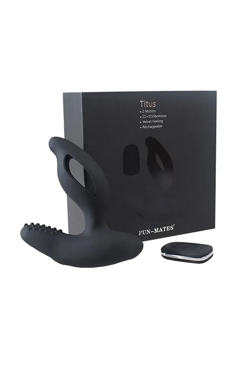 Titus - аккумуляторный двухмоторный стимулятор простаты обеспечивает мощный тройной подъем мужской силы, за счет предоставления удовольствия одновременно простате, а также зонам ануса и промежности. Изогнутый тонкий наконечник стимулирует простату, в то время как вибрация распространяется на две стороны вала для стимуляции ануса, а рельефный отросток уделяет внимание промежности – представляете насколько это должно быть мощно?! Вы не только испытаете ощущения, о которых не догадывались, поднимете все свои медицинские показатели, но и станете титаном в сексе! Никакого дискомфорта! Анатомическая форма массажера и несколько капель смазки помогут наиболее комфортно расположить стимулятор. Использование стимулятора в паре чревато долгой сексуальной игрой и ярким оргазмом! Все просто, брутально, приватно! Чёрная обтекаемая форма, пульт дистанционного управления с 11ю режимами вибрации, бесшумная вибрация – мужская сила и «стойкая жизненная позиция» надолго останутся вместе с тобой!