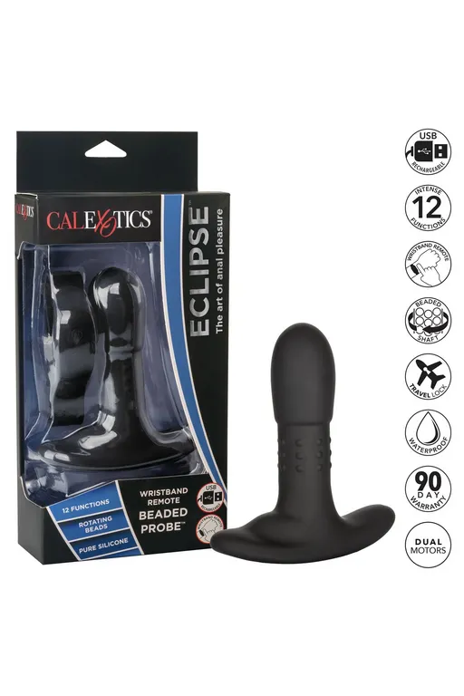 Eclipse Beaded Probe - перезаряжаемый стимулятор для воздействия на нервные окончания ануса с функцией "ротации" и управлением с помощью браслета. Он изготовлен из гладкого литого гигиеничного силикона высшего качества, обеспечивающего удивительно приятные и гарнировано безопасные тактильные ощущения. Два мощных мотора анального стимулятора обеспечивает 12 вариантов интенсивной вибрации и синхронизированной ротации шариков!