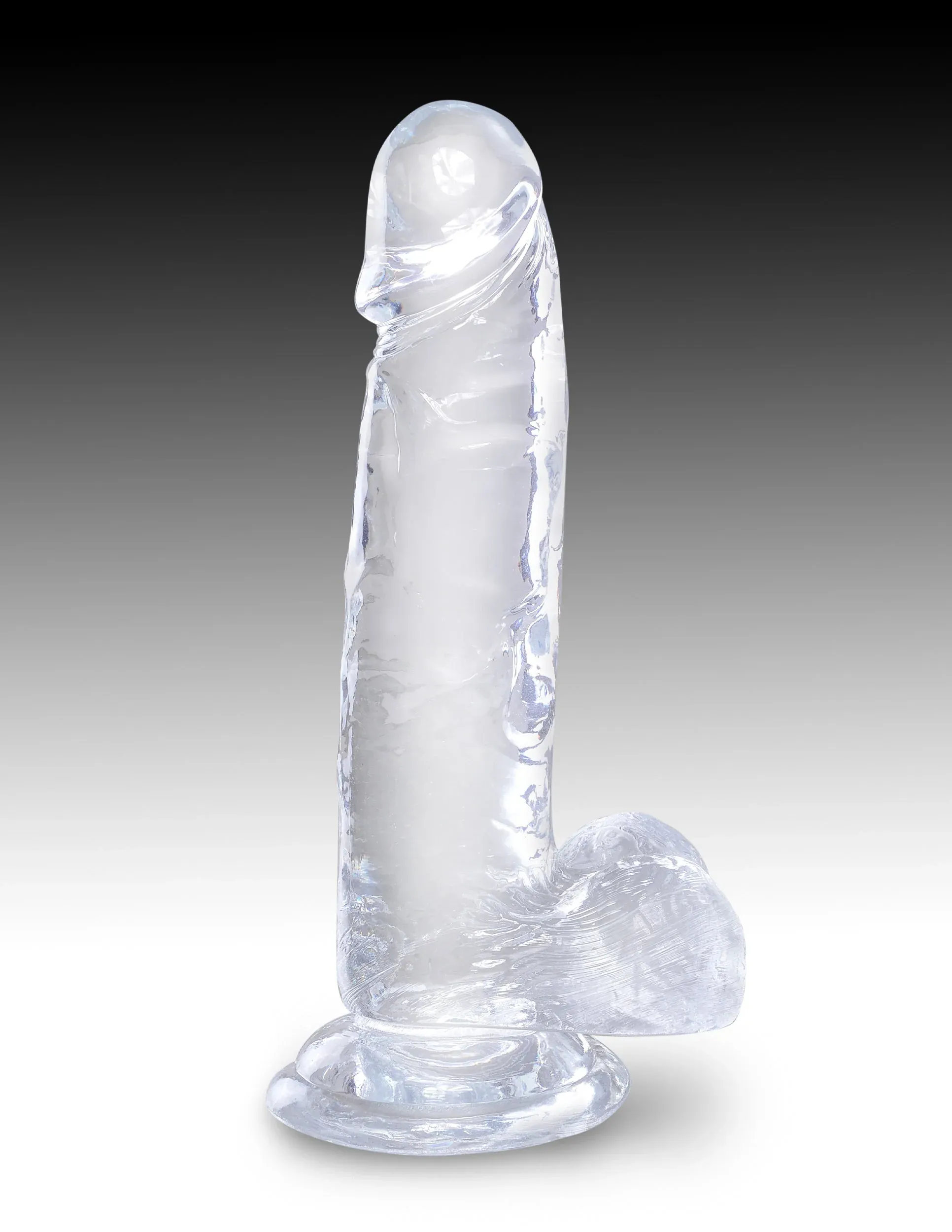 Фаллоимитатор King Cock Clear из прозрачного TPE (длина около 18 см). Гибкий ствол с деталями, присоска совместима с трусами для страпона. Без запаха, вес 0,39 кг. Легко чистить. Диаметр присоски - 7 см.