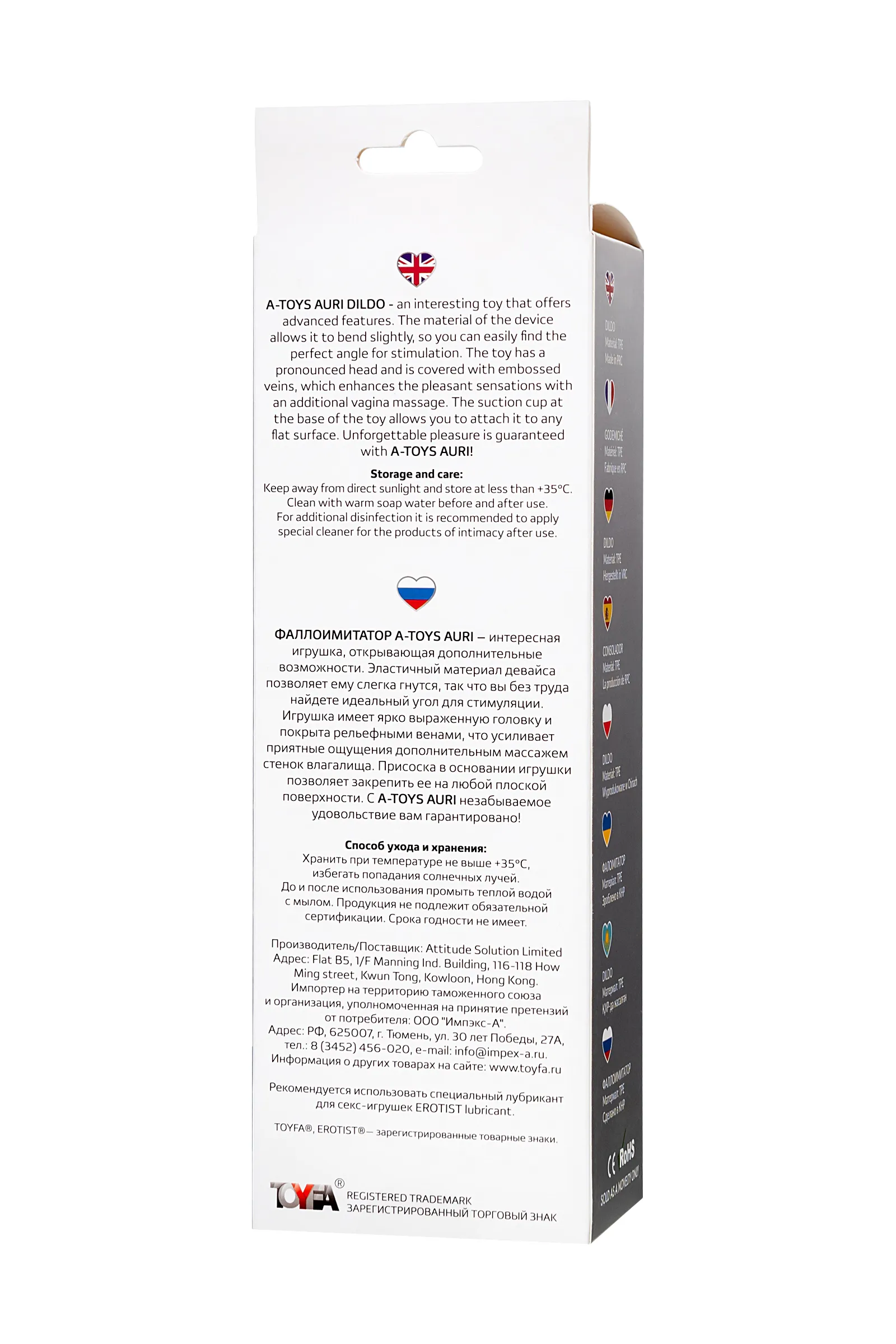Фаллоимитатор A-Toys Auri – интересная игрушка, открывающая дополнительные возможности. Эластичный материал девайса позволяет ему слегка гнутся, так что вы без труда найдете идеальный угол для стимуляции. Игрушка имеет ярко выраженную головку и покрыта рельефными венами, что усиливает приятные ощущения дополнительным массажем стенок влагалища. Присоска в основании игрушки позволяет закрепить ее на любой плоской поверхности. С A-Toys Auri незабываемое удовольствие вам гарантировано! Общая длина: 20 см Рабочая длина: 18,5 см Диаметр: 3,4 - 3,8 см