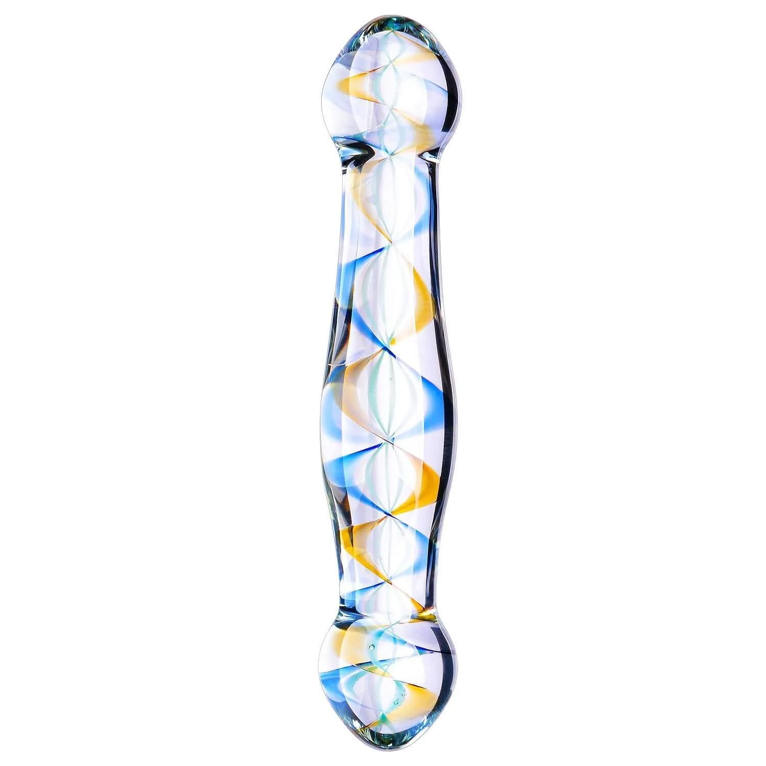 Двойной фаллоимитатор выполнен из прочного стекла и имеет приятную желто-синюю расцветку. Он гипоаллергенен и не обладает характерным запахом. Оба его конца увенчаны гладкой каплевидной головкой, а для усиления стимуляции ствол фаллоса имеет утолщение посередине. Также для получения новых ярких ощущений во время любовной игры попробуйте нагреть или охладить игрушку, чтобы испытать на себе контраст различных температур. Вы можете использовать фаллоимитатор в паре или в одиночку, все зависит только от Ваших предпочтений!