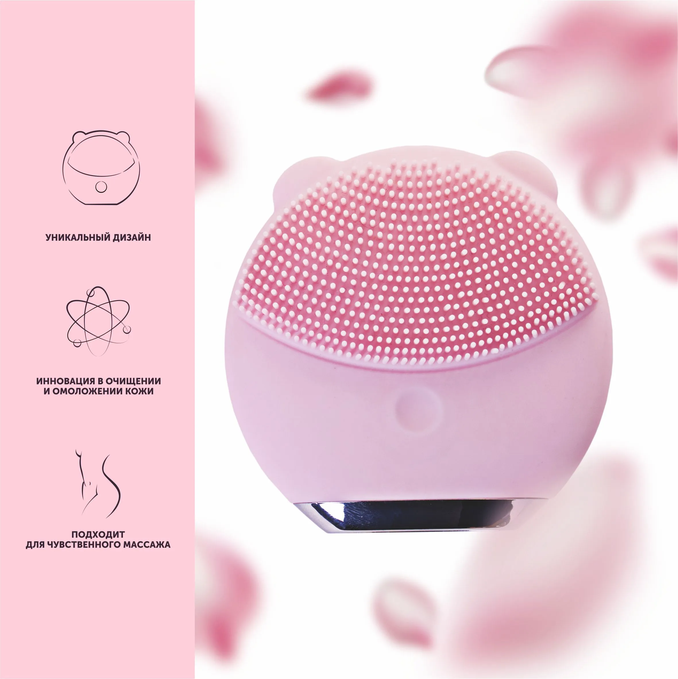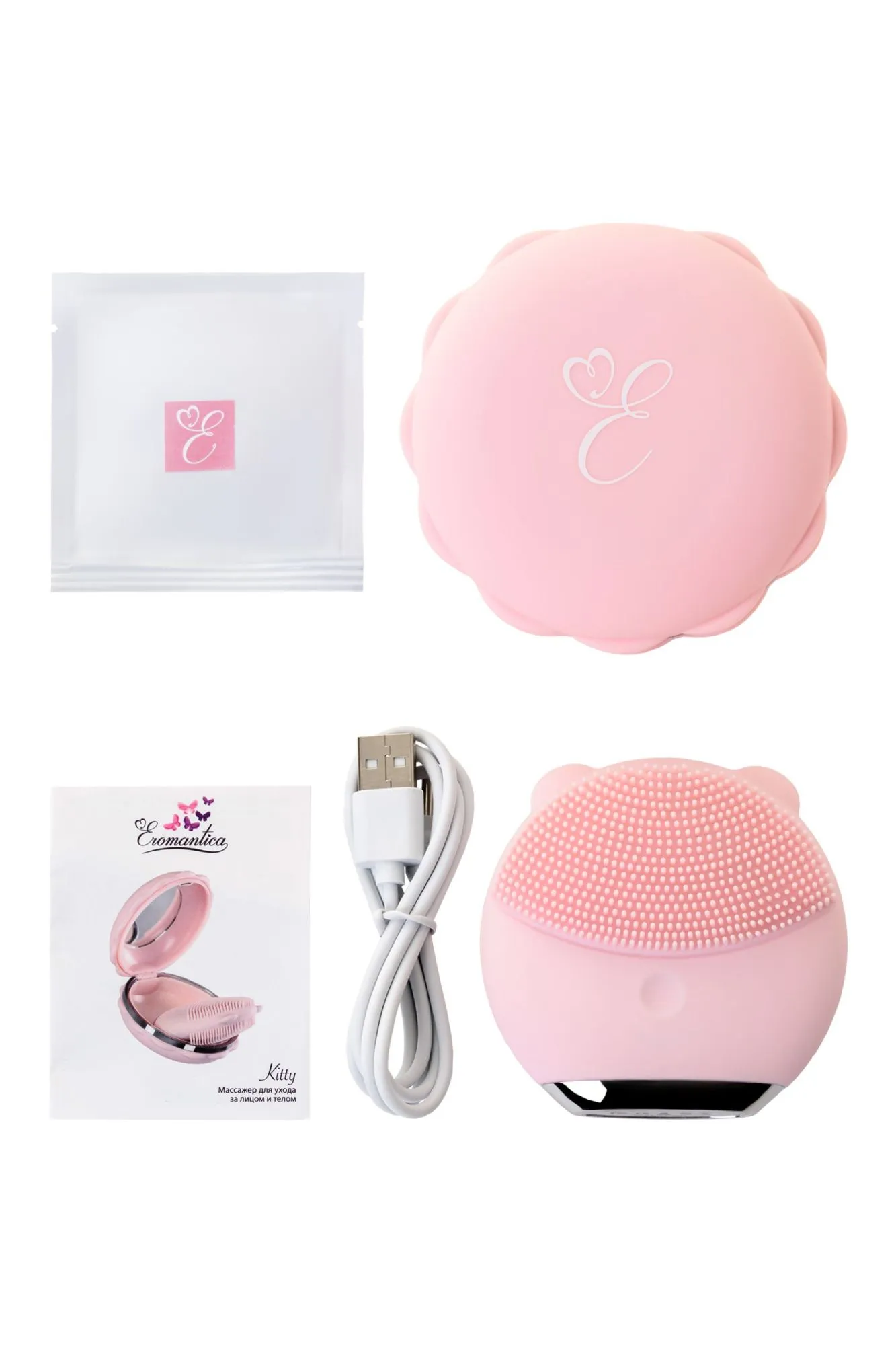 Для прекрасных женщин, которые любят себя и заботятся о своем теле, мы создали уникальный массажер KITTY. Милая пудровая кошечка с мягкими силиконовыми кисточками двух видов для самого нежного ухода за кожей лица и не только. Используй KITTY для очистки лица или расслабляющего массажа. С ее помощью ты легко удалишь остатки макияжа, а низкочастотная вибрация усилит кровообращение и сделает кожу эластичней. KITTY поможет улучшить эффект от твоего любимого крема, подтянуть овал лица и разгладить мелкие морщинки. Делай массаж чувственных зон своего тела и дари себе незабываемые ощущения. Смело используй KITTY в ванной - кошечка абсолютно водонепроницаема. Необычный дизайн шкатулки с зеркальцем в виде сладкого пирожного ни за что не выдаст секрет твоей красоты, улыбки и блеска в глазах. Позволь KITTY позаботиться о твоей коже и твоей жизни!