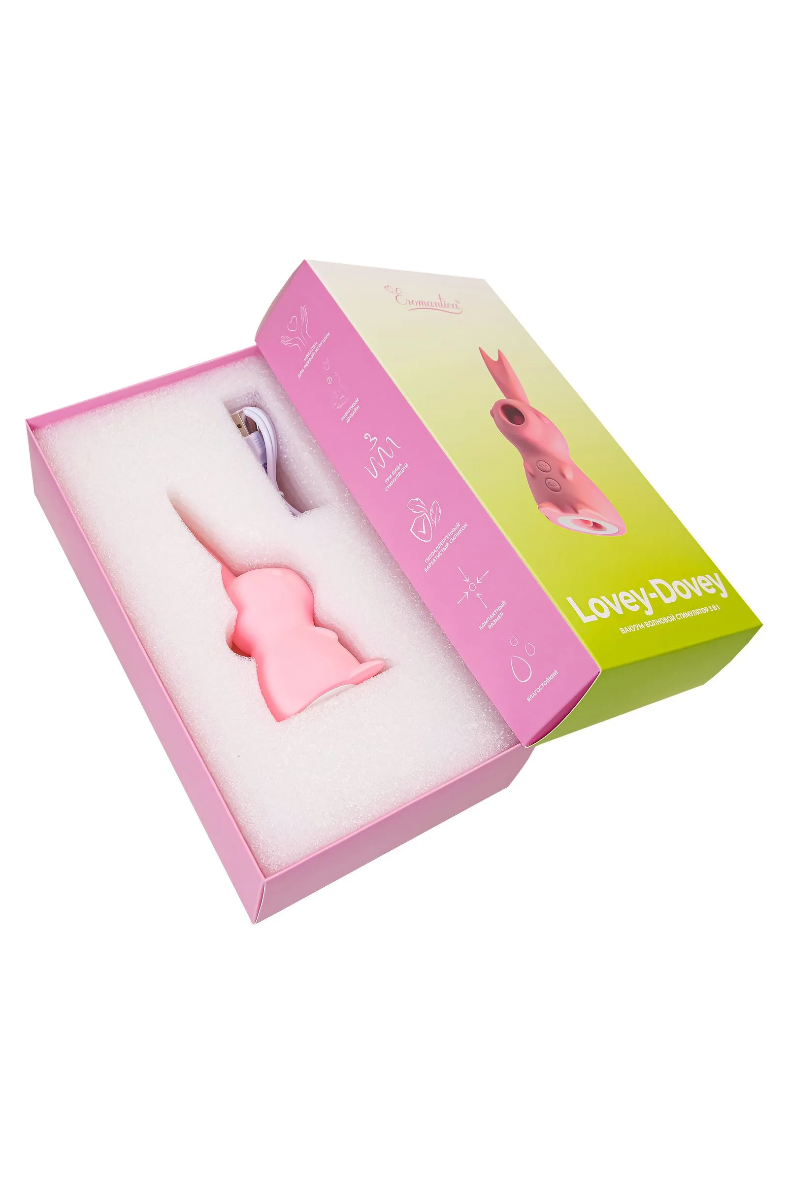 Стимулятор эрогенных зон в форме пудрового кролика Lovey-Dovey имеет три функциональных режима с широким спектром: • 7 режимов вибрации для массажа эрогенных зон, • 7 режимов вакуумной стимуляции клитора и стимуляция «язычком». Приятные ощущения от нежной точечной стимуляции бархатистых кроличьих ушек подарят обоим партнерам возбуждающие прикосновения и разнообразят любовные игры в паре. Вакуумная стимуляция от самой чувственной до по-настоящему мощной позволит Тебе достичь пика наслаждения на понравившейся скорости. А вариант стимуляции с «язычком» усилит воздействие вакуумных ласк и позволит прожить яркие сексуальные ощущения. Чувственный потенциал Lovey-Dovey откроет Тебе и партнеру мир поистине сказочного удовольствия вашей Страны Чудес!