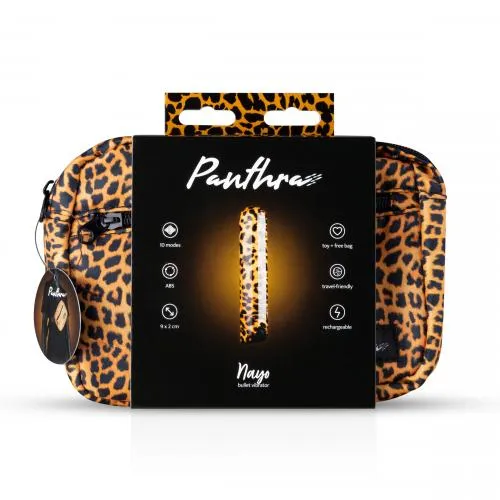 Nayo - шикарный миниатюрный вибратор леопардового цвета. Он изготовлен из несодержащего фталатов АБС-пластика и силиконовой кнопкой. Вибратор обладает 10 режимами вибрации. В комплект входит стильная леопардовая косметичка.