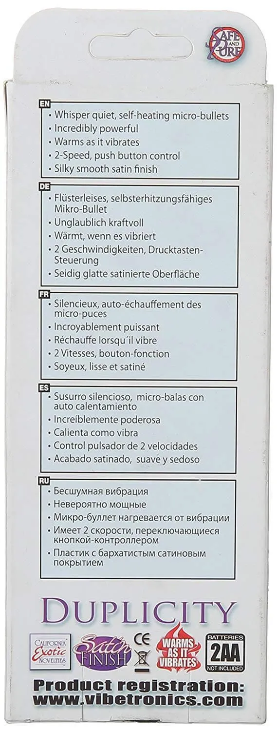 Duplicity - это две небольшие вибропули с пультом управления из коллекции Body & Soul. Такая игрушка идеально подойдет для одновременной стимуляции клитора и вагины, а также других эрогенных зон. Изделие имеет несколько режимов вибрации, которые легко регулируются с помощью выносного пульта управления. Вибропули выполнены из прочного пластика с бархатистым покрытием, поэтому они очень приятны на ощупь и будут нежно касаться Вашей кожи. С вибропулями Duplicity Вы можете играть в одиночку или вместе с партнером во время страстной прелюдии.