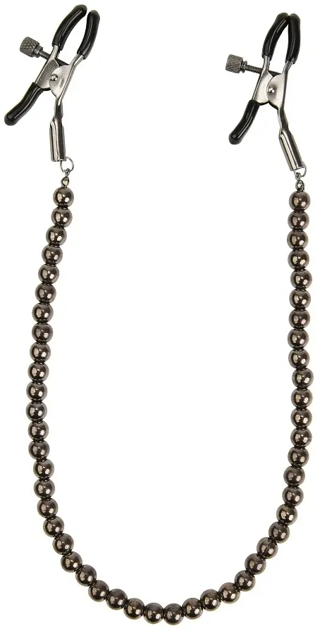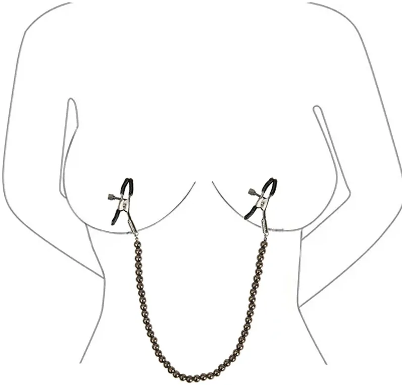 Зажимы на соски с цепочкой из бусин служат дополнительным стимулятором одной из самых чувствительных зон.Включают в себя 2 полностью регулируемых многофункциональных зажима. Имеют мягкие наконечники,между собой зажимы соединены цепью из бусин, которая одновременно служит своебразным утяжелителем для дополнительных ощущений.