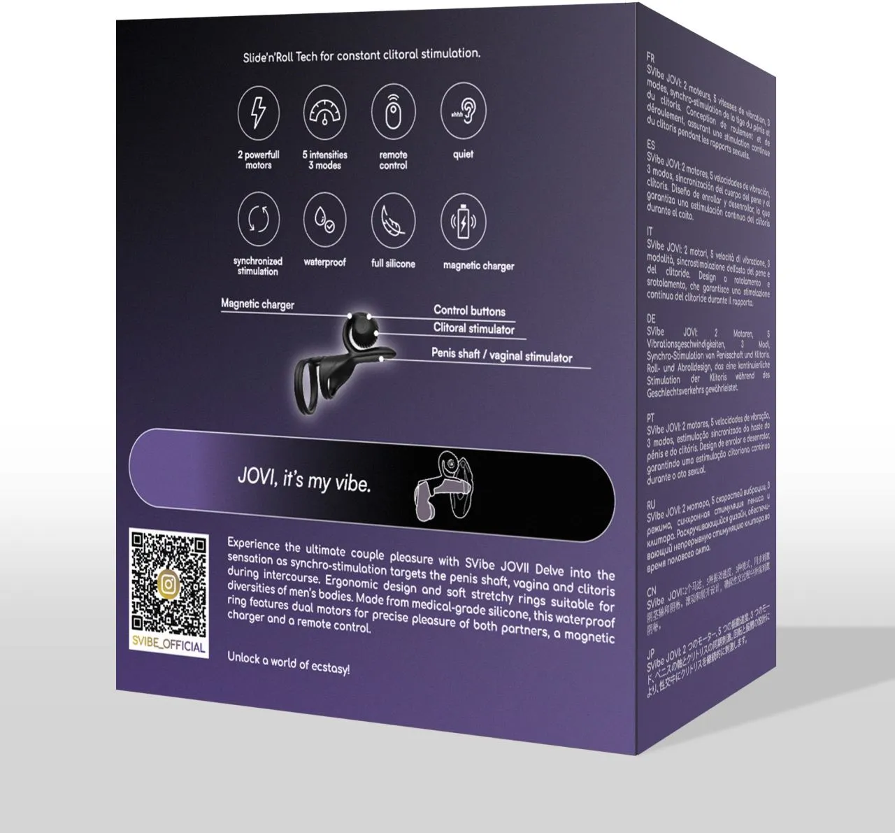 Испытайте максимальное парное удовольствие с SVibe JOVI! Испытайте новые ощущения вместе с партнером благодаря технологии Slide’n’Roll и двум моторам с 5 уровнями и 3 режимами вибрации, обеспечивающими синхронную стимуляцию ствола, влагалища и клитора во время полового акта. Эргономичный дизайн и мягкие эластичные кольца подходят под анатомические особенности и разнообразие размеров мужских тел. Изготовленное из медицинского силикона, кольцо оснащено двумя моторами для точечного удовольствия обоих партнеров, беспроводным магнитным зарядным устройством и пультом дистанционного управления. Откройте для себя мир экстаза!