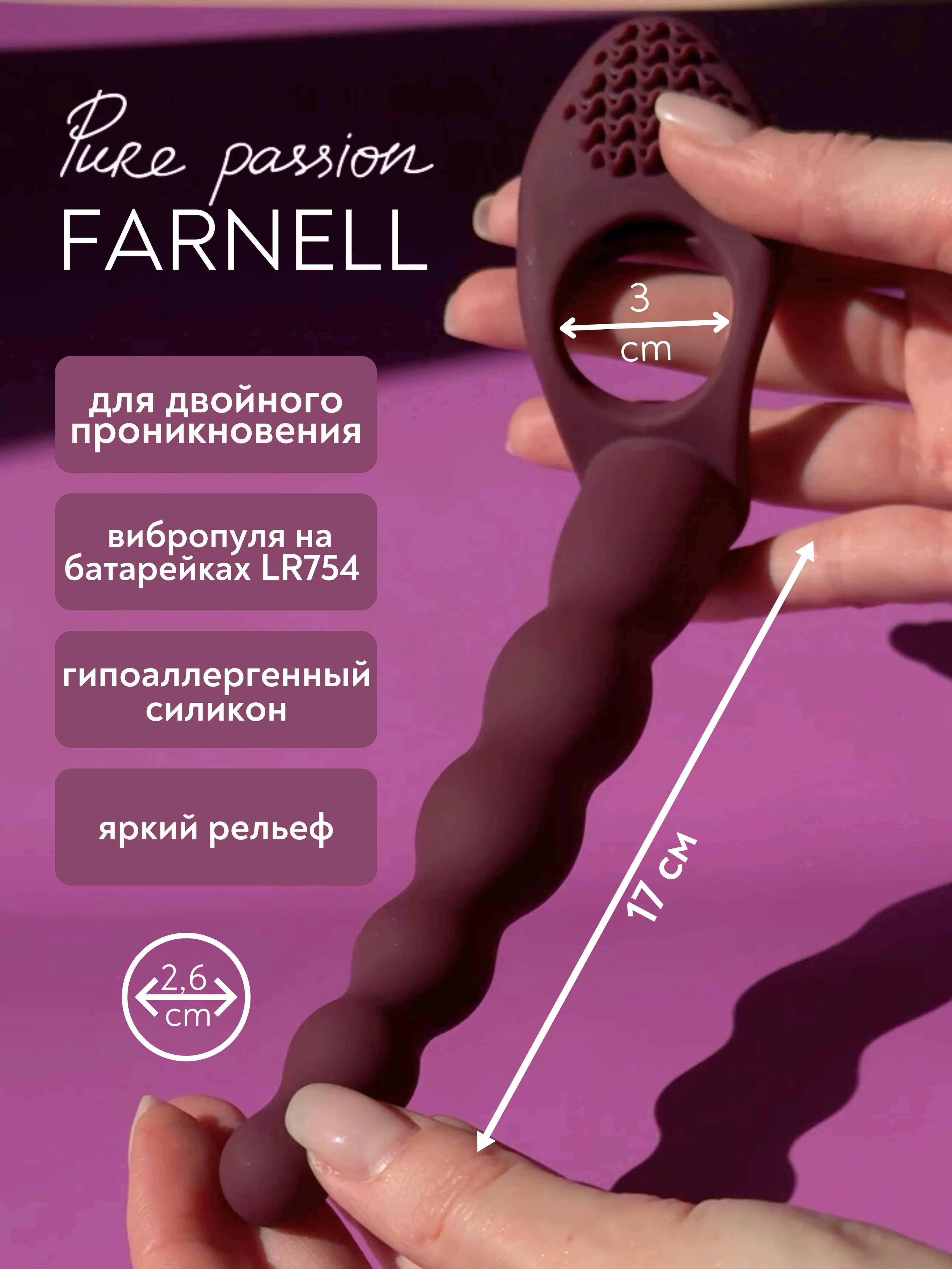 Насадка для двойного проникновения Farnell из гипоаллергенного силикона. Обладает рельефной и гибкой формой. Надежно и крепится у основания члена благодаря силиконовому кольцу. Внутренний диаметр кольца– 3 см. Кольцо хорошо тянется и подходит на любой размер. Вибропуля в верхней части для клиторальной стимуляции добавит приятных ощущений партнёрше. Работает от батареек-таблеток, которые входят в комплект. Длина насадки - 17см.